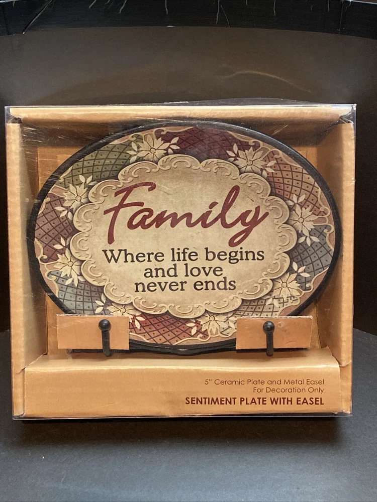 This beautiful 5" sentiment plate from Kirkland's is a perfect gift for a family. The plate features a lovely floral and scroll pattern with the word "Family”in the center. Made of high-quality ceramic, this plate is perfect for display on an easel or can be used as a decorative piece. It was produced using art pottery techniques and is from the 21st century era. The plate was manufactured in China and has an American cultural influence. It is new and comes in its original box.