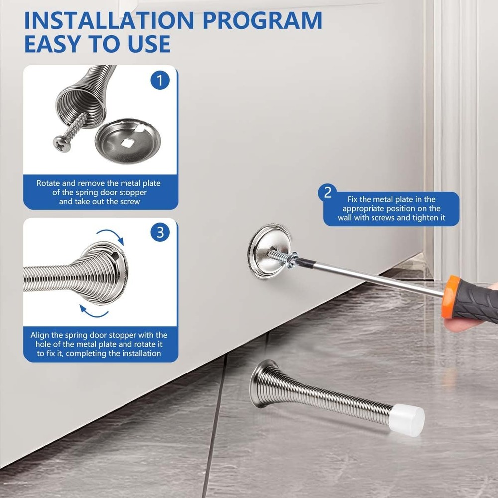 KISEER 12 Pack Spring Door Stops 3 1/4 Inch Flexible 12 Pack, Satin Nickel Product Details High-quality: Our wide base design restricts those heavy, fast swinging doors from slamming into your walls and creating those dreaded doorknob holes, while also safeguarding your wood, steel, and fiberglass doors from marks and scrapes. Safe for Kids: We know that babies and small children are always so fascinated by spring door stops, but parents can be worry-free because your toddlers will have a much more difficult time removing the firm rubber tips from our uniquely designed low mounted door stops, which will likely reduce the risk of the door stop tips becoming a choking hazard. Easy to Install: Doorstop is extremely easy to install within 1 minute. The door stop spring is 3 ? inches and comes with mounting screws and bases. All you need is a screwdriver or driller. So simple that even adolescents can finish by themselves. Start a funny DIY door stopper decorative installation. Keep those damage and repair bills away with KISEER higher quality door stoppers. Packaging Includes: 12 Pack door stoppers, 12 pack rustproof screw. Use them behind every door in your home to beautifully match all of your other Satin or Brushed Nickel home accessories and decorations. You can even give them to family or friends for the perfect housewarming gift.