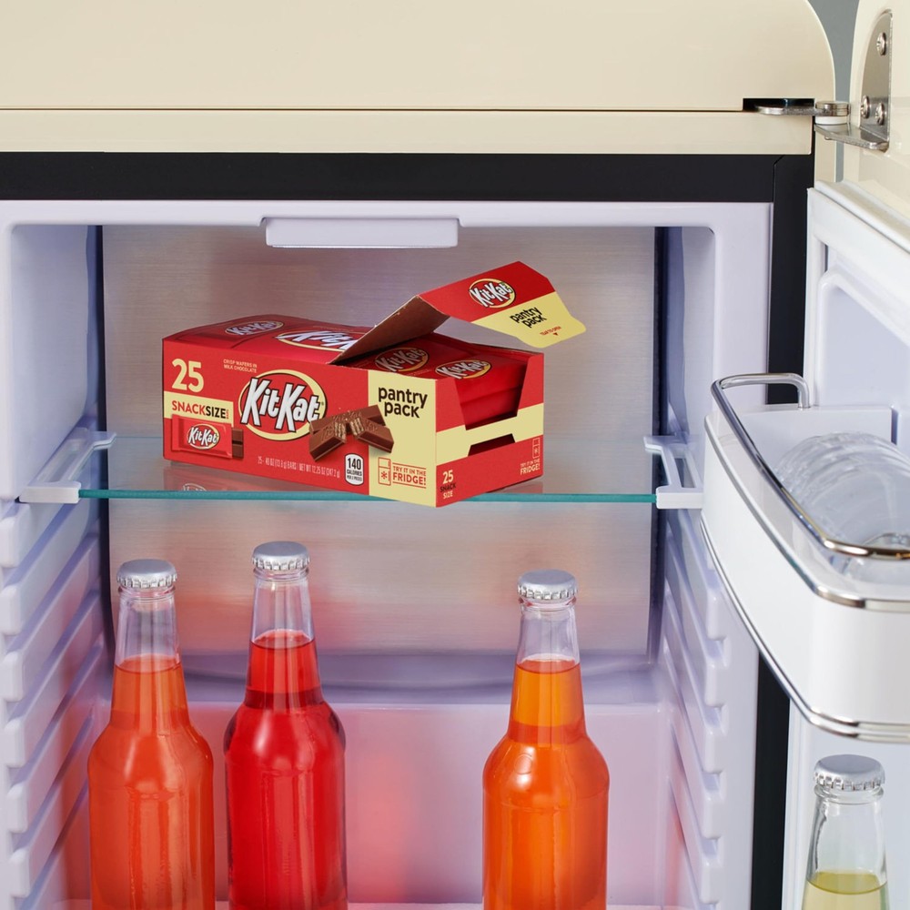 Contains twenty five (25) 0.49-ounce packs of KIT KAT Milk Chocolate Wafer Snack Size Candy Bars in a 12.25-ounce pantry pack Keep your favorite milk chocolate wafer candy neat and organized with a KIT KAT pantry pack candy box that you can store in the pantry or fridge Includes 25 individually wrapped, kosher certified KIT KAT milk chocolate wafer candy bars in a stackable box to protect your snack size candy treats Use this KIT KAT pantry pack during relaxing moments alone, movie nights with friends and snacking moments at your desk anytime you need a sweet chocolate and wafer snack Chill, store and enjoy these crisp milk chocolate sweets during Valentine's Day, Easter, Halloween and Christmas celebrations