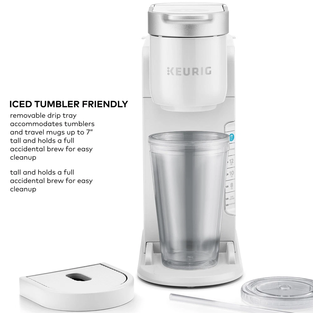 The Keurig® K-Iced™ coffee maker. Enjoy refreshingly delicious iced coffee and full-flavored hot coffee from one multitalented coffee maker. Brew the perfect coffee for any craving, mood, or mouthwatering moment. Always easy, always right. It’s all in the, blue Brew Over Ice button. One push, and the K-Iced™ coffee maker automatically adjusts the brew temperature, starting hotter to extract full flavor, then cooling down to minimize ice melt. All for a vibrant, balanced iced coffee that never tastes watered down. The K-Iced™ coffee maker also brews the same full-flavored hot coffee that you love. And if you want a stronger cup, the Strong Brew setting gives your hot coffee a bolder, more intense taste. Whether you’re brewing iced or hot, choose from 3 cup sizes — 8, 10, and 12oz (for iced coffee, including ice). And the 42oz removable reservoir lets you enjoy multiple deliciously refreshing cups between refills. BREW OVER ICE: Automatically adjusts brew temperature — starting hotter to help extract full flavor, then cooling down for less ice melt. STRONG BREW: Brew a stronger, more intense hot coffee. 3 CUP SIZES: 8, 10, and 12oz (for iced coffee, includes ice). 42oz REMOVABLE RESERVOIR: Allows you to brew up to 4 cups between refills. FAST & FRESH-BREWED: Delicious iced coffee and hot coffee made in minutes. ICED TUMBLER FRIENDLY: Removable drip tray accommodates tumblers and travel mugs up to 7” tall and holds a full accidental brew for easy cleanup. ENERGY EFFICIENT: Auto off feature turns off your coffee maker 5 minutes after the last brew, helping to save energy. COMPATIBLE WITH THE MY K-CUP UNIVERSAL COFFEE FILTER: Brew using your own ground coffee (sold separately).