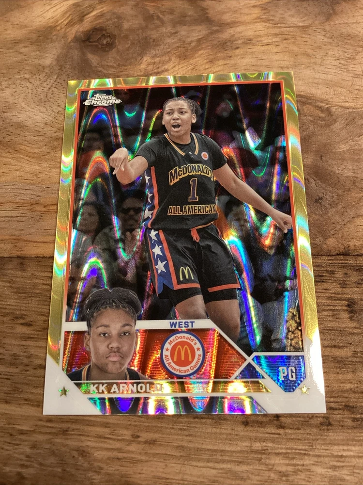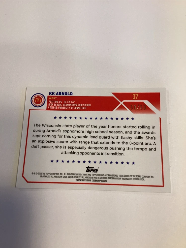 Up for auction is a highly sought-after 2023 Topps Chrome McDonald's All-American trading card featuring KK Arnold of the UConn Huskies. This limited edition card boasts a print run of only 50 and features a stunning gold ray wave parallel/variety. The card is serial numbered and is a short print insert, making it a must-have for any serious basketball card collector. The card is in excellent condition and would make a great addition to any sports trading card collection. Don't miss out on the opportunity to own this exclusive and rare card.