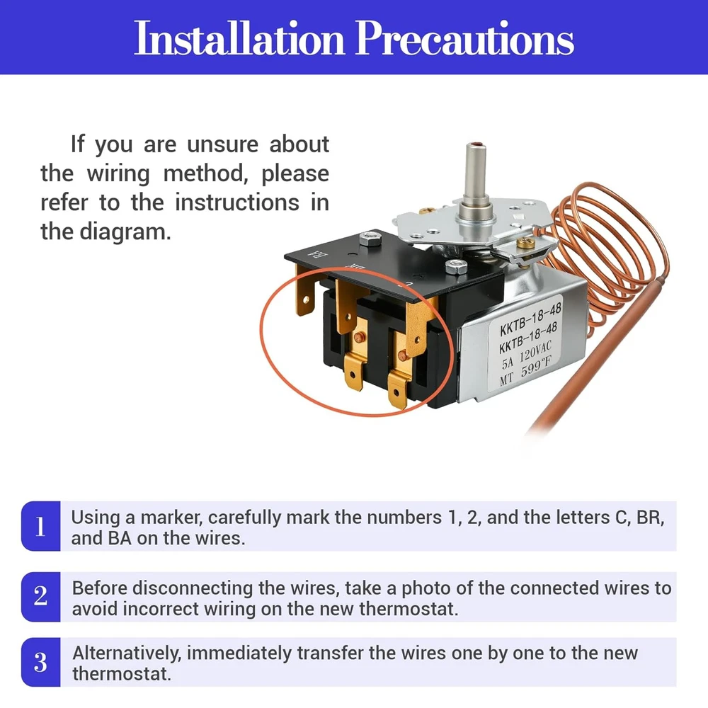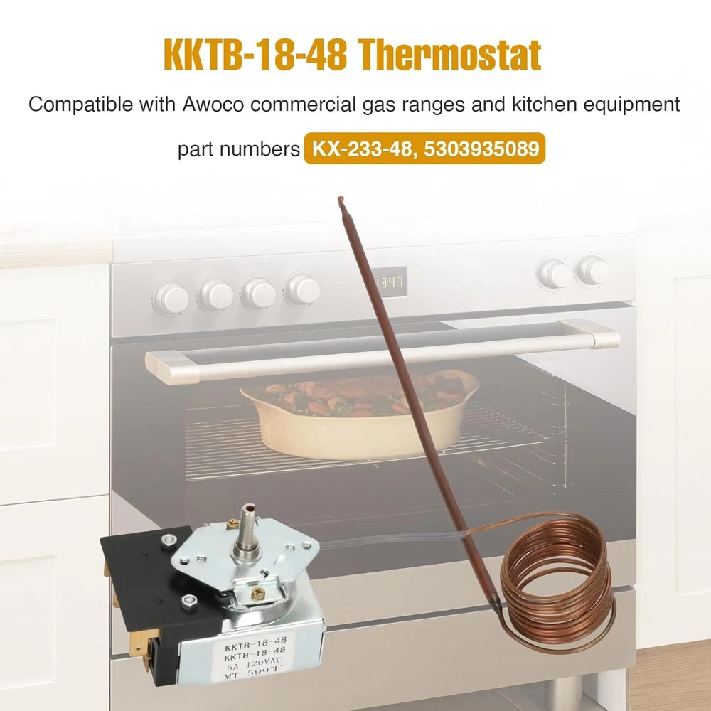 KKTB-18-48 Oven Thermostat – 5A 120VAC Max Temperature 599°F For Robertshaw 【Perfectly Compatible KKTB-18-48 Oven Thermostat】Compatible with Robertshaw KKTB-18-48 thermostats, widely compatible with Awoco 30” and 36” gas ranges, for Thor part number (07.12.0017-A0, HRD4803U), for Forno more, for Zline Nxr Modoo range thermostat kktb-18-48. Please verify your old part number and image before purchasing to ensure exact match 【Part Number and Compatible Models】Part number kktb-18-48, G36X03-030900-1. Compatible with FFSGS6239-30, FFSGS6239-36, FFSGS6239-48, FFSGS6260-30, FFSGS6260-36, FFSGS6260-48, FFSGS6244-36, FFSGS6244-48, XTA-PR30, XTA-PR36, XTA-PR48, 07.12.0017-A0 and HRD4803U more gas range stoves 【Precise Temp Control: 150–599°F】Our KKTB-18-48 thermostat is rated at 5A and 120V AC. This gas stove thermostat replacement integrates baking (150-500°F) and broiling (up to 599°F) modes. Designed for heavy-duty use. Precise temperature control is achieved through the front-mounted knob 【Brass and Stainless Steel Build】The KKTB-18-48 oven thermostat features a 48″ nickel-plated copper capillary tube and a 3/16″ × 11″ copper sensing bulb. The flexible design allows flexible routing during installation and withstands frequent use and temperature changes for long-lasting, reliable performance 【Solve Multiple Oven Issues】Still having trouble with oven temperature control? The KKTB-18-48 oven thermostat helps fix common problems like the oven not reaching the set temperature, uneven heating, broiler not igniting, or large temperature swings 【Replacement for KKTB-18-48 Range Oven Thermostat】Replaces many older thermostat models, offering a cost-effective and reliable repair solution. If you encounter any issues while using our product, we will assist you as soon as possible Payment Delivery details Return Policy Warranty Contact Us Payment Winning bidder must make arrangement for payment within three days, if payment is not made within 7 days unpaid item reminder will be filed. Delivery details We will attempt to ship your item within 1-2 BUSINESS DAYS after payment has been received. We do not ship to any destinations that are not specified in our listings. We ship to the continental 48 states; we do not ship to Alaska, Hawaii, Guam, The Virgin Islands, or Puerto Rico. Please note on some items delivery time may be longer than expected because of the Complexity of the orders, Message us for the most accurate ETA for your order. 99.9% of our orders ship within the 2 days handling time . Return Policy The following terms apply if you are returning something that was not shipped to you in error or showed up defective NO returns will be accepted after 30 days. If an exception is made and a return is accepted after 30 Days there will be a 40% restocking fee. Merchandise MUST be in new condition. All freight must be pre-paid by the customer. Shipping in non-refundable - Items with free shipping will be charged the actual shipping cost Part must be new, uninstalled, in original box. Warranty The warranty for your item should be stated in the product description. For any warranty claims, please send eBay Message - providing proof of purchase and a brief explanation of defect. We will then send warranty procedure and details. Warranty items will be replaced with the same or equivalent items. Refunds will not be given in a warranty circumstance. Contact Us Our professional Customer Service is available at our working hours: Monday-Saturday 9:00am-6:30pm(China Standard Time) Once you get the item please inspect it and make sure you get exactly what you paid for. Once you satisfy with our products and service, please leave positive feedback and 5 Stars in four areas of DSR(Detail Seller Rating) for us and we will do the same for you. If you feel that you got an item that is different from what you ordered or if it arrived damaged or if you are not satisfied with the item please email us and we will love to work with you in resolving any issues.
