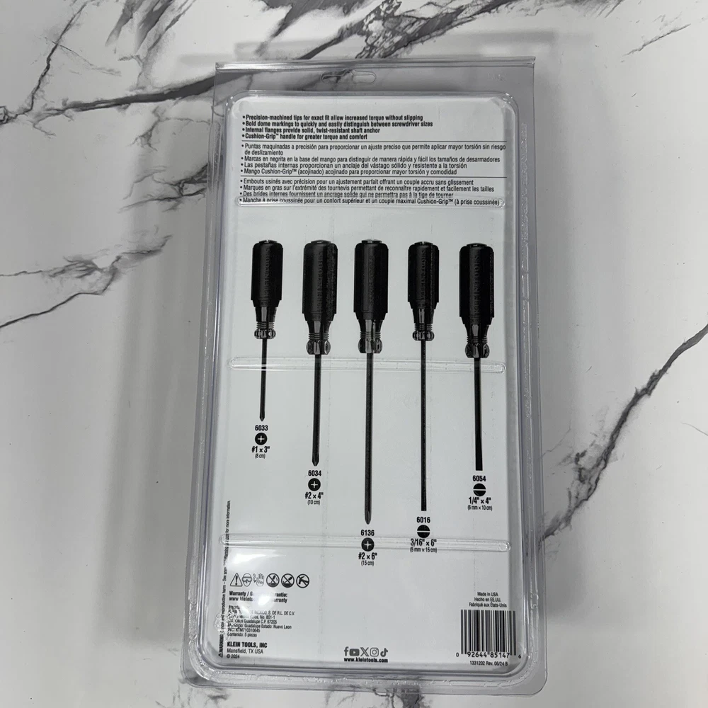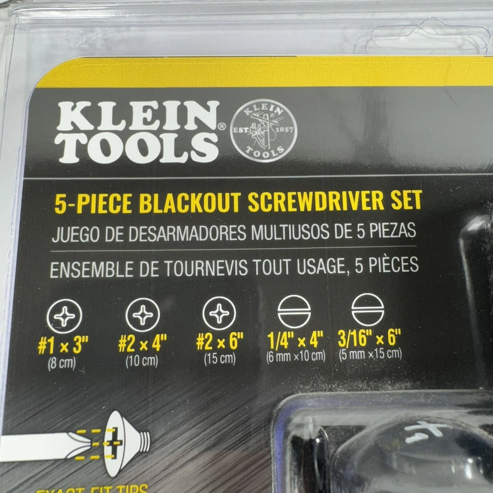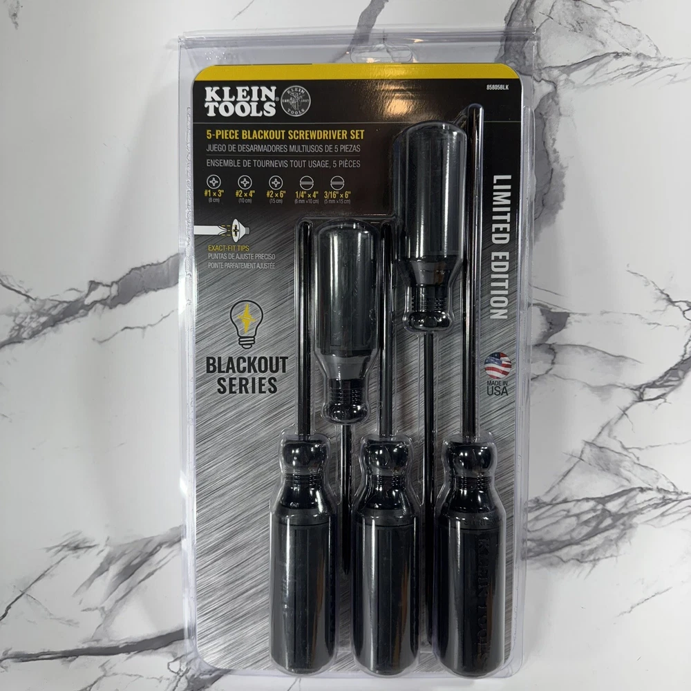 KLEIN Tools 5 Piece Blackout Series Screwdriver Set Limited Edition Made in USA! 85805BLK You'll know exactly which drivers are yours on the jobsite. These are perfectly blacked out. Black Grips, Black plastic, Black shanks! 5 Piece Set Includes: (1) #1 x 3" (1) #2 x 4" (1) #2 x 6" (1) 1/4" x 4" (1) 3/16" x 6" MADE in USA We ship daily. Your item will ship SAME DAY!!