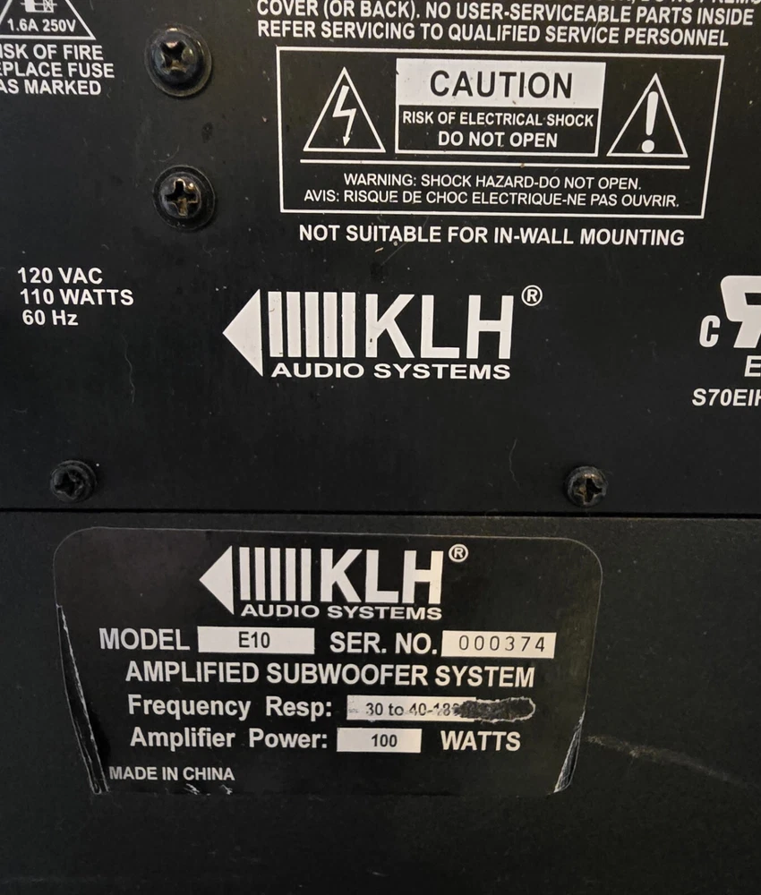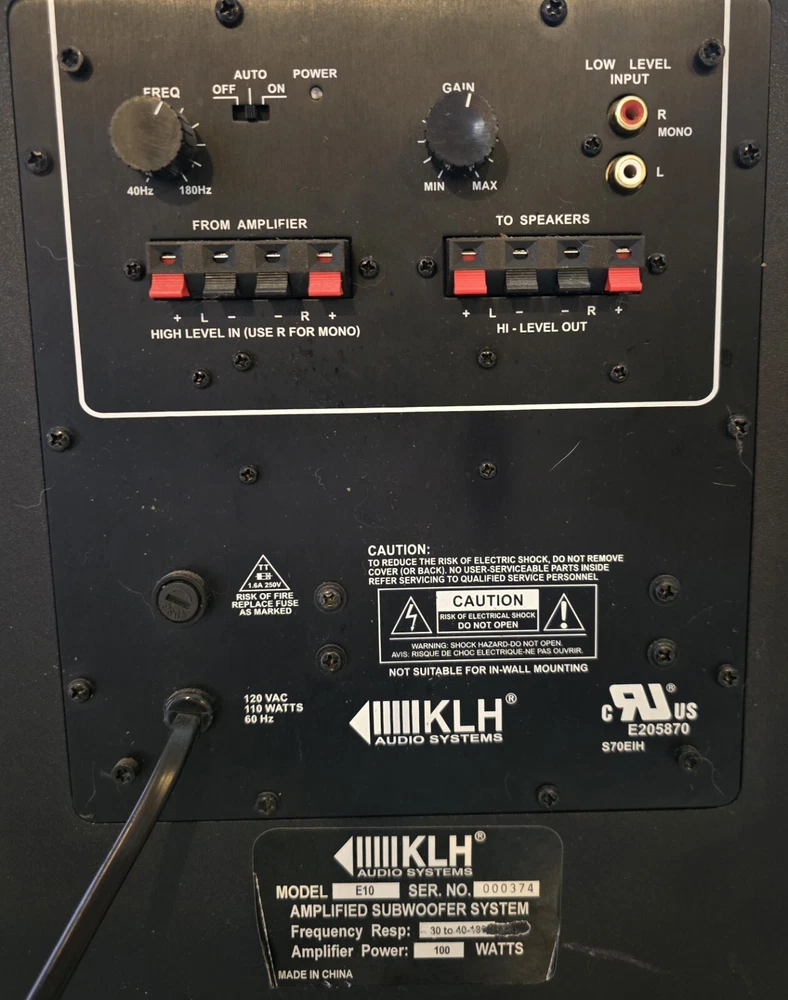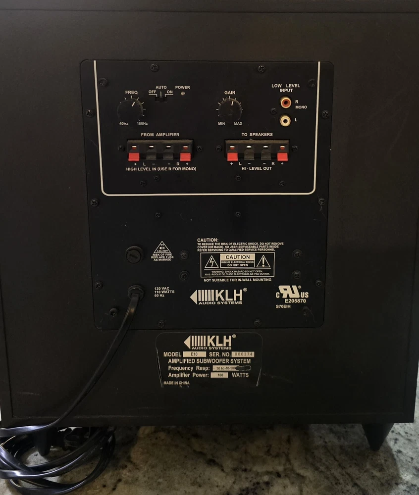 Audio Inputs: Stereo L/R RCA System Configuration: Powered Subwoofers Color: Black Connectivity: Wired Item Length: 14” Features: High End, Design Shape: Cube Model: E10 Type: Subwoofer Item Width: 14” Item Height: 15” Brand: KLH