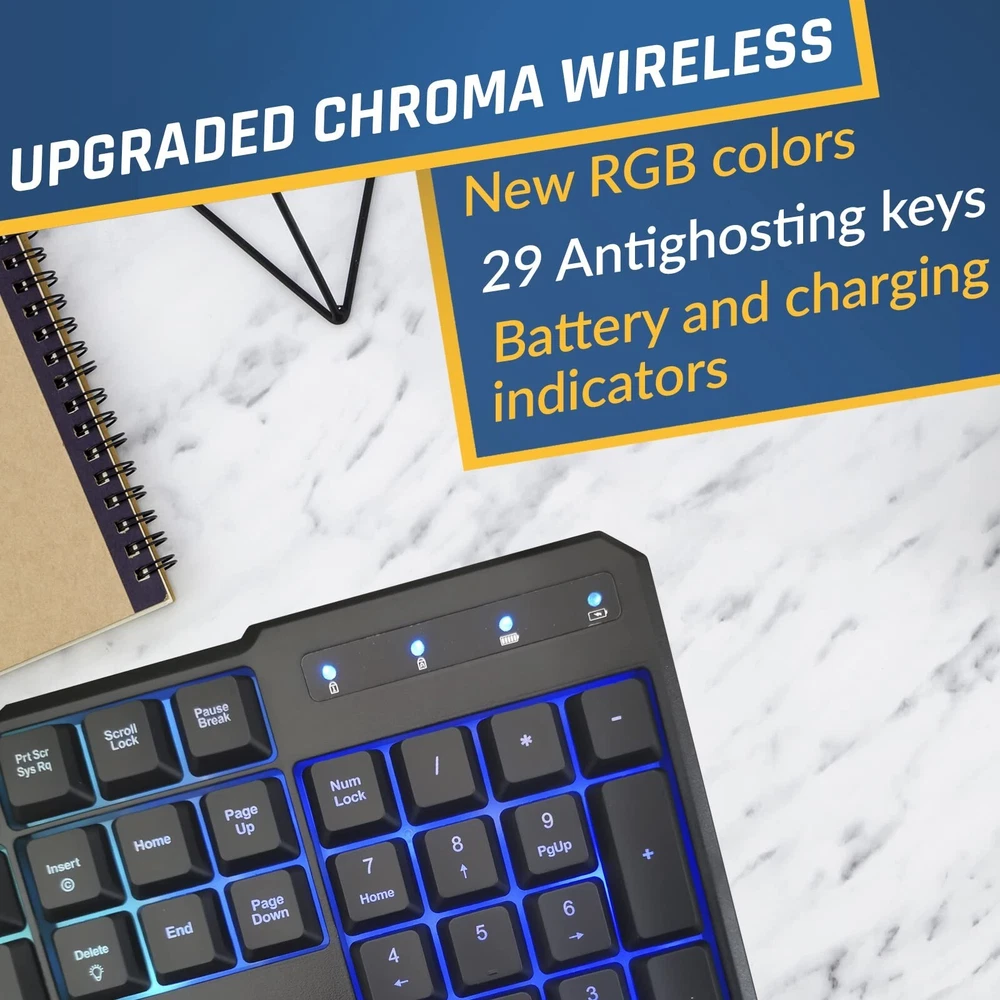 KLIM Blaze & Chroma Wireless Bundle - New 2024 - Wireless Gaming Keyboard and Mouse Combo - Responsive Durable Ergonomic - Backlit Keyboard - RGB Gaming Mouse Wireless - Long-Lasting Built-in Battery Product Details Style: Keyboard + Mouse Set Brand: KLIM MPN: KLCHR3973 EAN: 3701152103973 UPC: Does not apply Brand: KLIM Color: Black Connectivity Technology: Usb Special Feature: Ergonomic, Backlit Compatible Devices: Laptop, Gaming Console, Personal Computer Product Dimensions: 17 x 5.8 x 1.1 inches Item Weight: 0.634 ounces Manufacturer: KLIM Country of Origin: China Batteries: 2 Lithium Ion batteries required. (included) Date First Available: March 31, 2022 2 DONGLES FOR BETTER PERFORMANCE. Quick response time and reliability are essential when gaming. By using 2 different USB receivers (one for the keyboard and one for the mouse), you're sure to play in the best conditions withtout any limitations. Note: Be sure to have 2 USB free slots available on your laptop/PC before using the KLIM Chroma + Blaze Bundle. OUR TOP PERFORMING DUO IN A COMBO PACKAGE. Over a quarter million units sold collectively! Now, seize the opportunity to acquire this incredible bundle all at once! Delight in a comfortable, vibrant, and hassle-free typing experience with the KLIM Chroma keyboard. Experience the exceptional performance of the KLIM Blaze, featuring an accurate sensor and an ergonomic design. EXCLUSIVE & UPDATED VERSION. New RGB Effects + 29 antighosting keys + Windows lock function + 2 new LED indicators (Battery + Charging). This new version of the KLIM Chroma WL includes all you need to perform at your best! LONG-LASTING BATTERY. Use this keyboard and mouse for many days thanks to their integrated rechargeable battery and save on disposable ones. You'll also be contributing to a healthier environment with less waste and energy consumption. ROBUST DURABILITY WITH 5-YEAR PROTECTION. Constructed with highly-resistant ABS plastic and a special keycap coating, the KLIM Chroma is built to last. The KLIM Blaze boasts 20 million click-resistant Huano switches and a dependable PixArt sensor. Supported by a steadfast 5-year assurance and 24/7 customer service, your purchase is entirely secure.