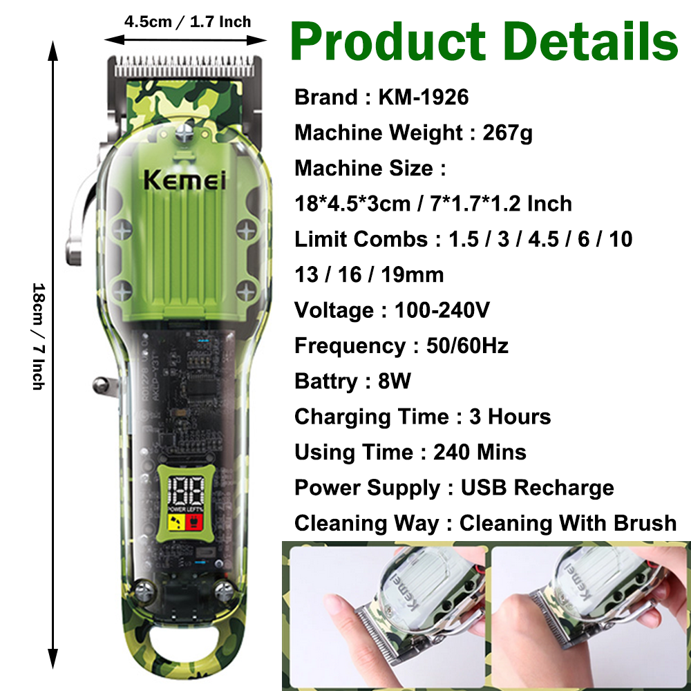 Features: 1.Powerful long-life motor cute-angled moving blade, sharp and durable 2.Considerate and digitalized smart LCD display for reminder, 6300rpm/min strong power, Less than 55dB low noise, Once charging can last up to 240-min working time 3. Newly designed acrylic material, sturdy and durable, with a beautiful appearance, you can directly see the internal parts. Specification : Brand : KM-1926 Machine Weight : 267g Machine Size : 18*4.5*3cm / 7*1.7*1.2 Inch Voltage : 100-240V Frequency : 50/60Hz Batt e ry : 8W Charging Time : 3 Hours Using Time : 240 Mins Power Supply : USB Recharge Cleaning Way : Cleaning With Brush Package list : 1 * Hair clipper 8* Limit combs (1.5/3/4.5/6/10/13/16/19mm) 1 * USB cable 1 * Cleaning brush 1*Manual