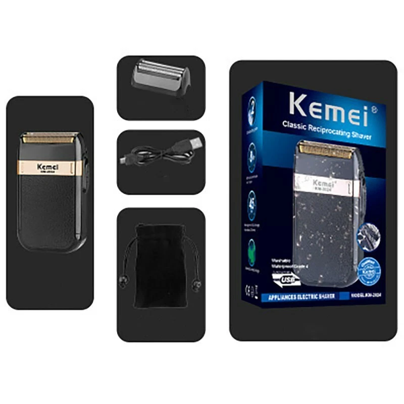 KM-2024 Waterproof Shaver for Men Cordless Rechargeable Razor Shaving Tool 2023 Description Washable electric shaver - Built-in 800mAh electricity - Dual refined mesh blade for smooth operation - Long Duration Time: 45-minute using time - Easy Operation: Just push the ON/OFF button upwards or downwards - Prolonged Service Life: 5W motor and its stainless steel body make it last for long time - Fast to Charge: Takes 8 hours to charge Specifications: - Brand Name: KEMEI - Model: KM-2024 - Color: Black - Razor Blade: Twin Reciprocating Blade - Voltage: 220V - Electricity: 800mAh - Power Supply: USB Rechargeable Type - Charging Time: 8 hours - Using Time: 45 minutes - Cleaning Method: Whole body washable - Power: 5W - N.W.: 70g Package Content: - 1 x Main Unit - 1 x Golden Mesh Blade - 1 x Silver Mesh Blade - 1 x Charging Cable - 1 x Storage Bag Note: Please allow a slight size difference due to manual measurement. Due to the different display and different light, the picture may not show the actual color of the item. Payment We only accept PayPal and Credit Cards . PayPal is the only online payment method we accept. Please make sure you have a valid/confirmed PayPal account prior bidding. And please make sure that your PayPal registered address is the same with your eBay registered address. Shipping Your parcel will be sent within 5 working days. If you do not receive your item within 30 working days since payment finished, please contact us immediately for further assistance. Note: It may takes more than 30 working days to other countries such as Mexico, Brazil, Chile, Peru, because they are far away from China. PS: We also offer faster shipping service (3-5 days to deliver), such as DHL, EMS, but buyers need to pay for the extra shipping cost. Please contact us if you need it. Customs Declaration: Import duties, taxes and charges are not included in the item price or shipping charges. These charges are the buyer's responsibility. Please check with your country's customs office to determine what these additional costs will be prior to bidding. Return Policy If you are dissatisfied with our item or service, then please contact us via eBay message before leaving any feedback. We are committed to resolve all issues in a friendly and satisfactory manner. We always reply to eBay messages within 1-2 business days. If you do not get a response from us, then please check your eBay message. Only unused, un damaged and original condition item can be qualified for a return. Returned products that are not in original packaging or with something missing are subject to minimum 30% to 50% of the total price. The seller is not responsible for returned parcels due to incomplete address or address impossible to deliver to . Feedback: We strive for 100% customer satisfaction! If you have any questions, please feel free to contact us instead of leaving negative feedback. We will reply your e-mail within 24 working hours.