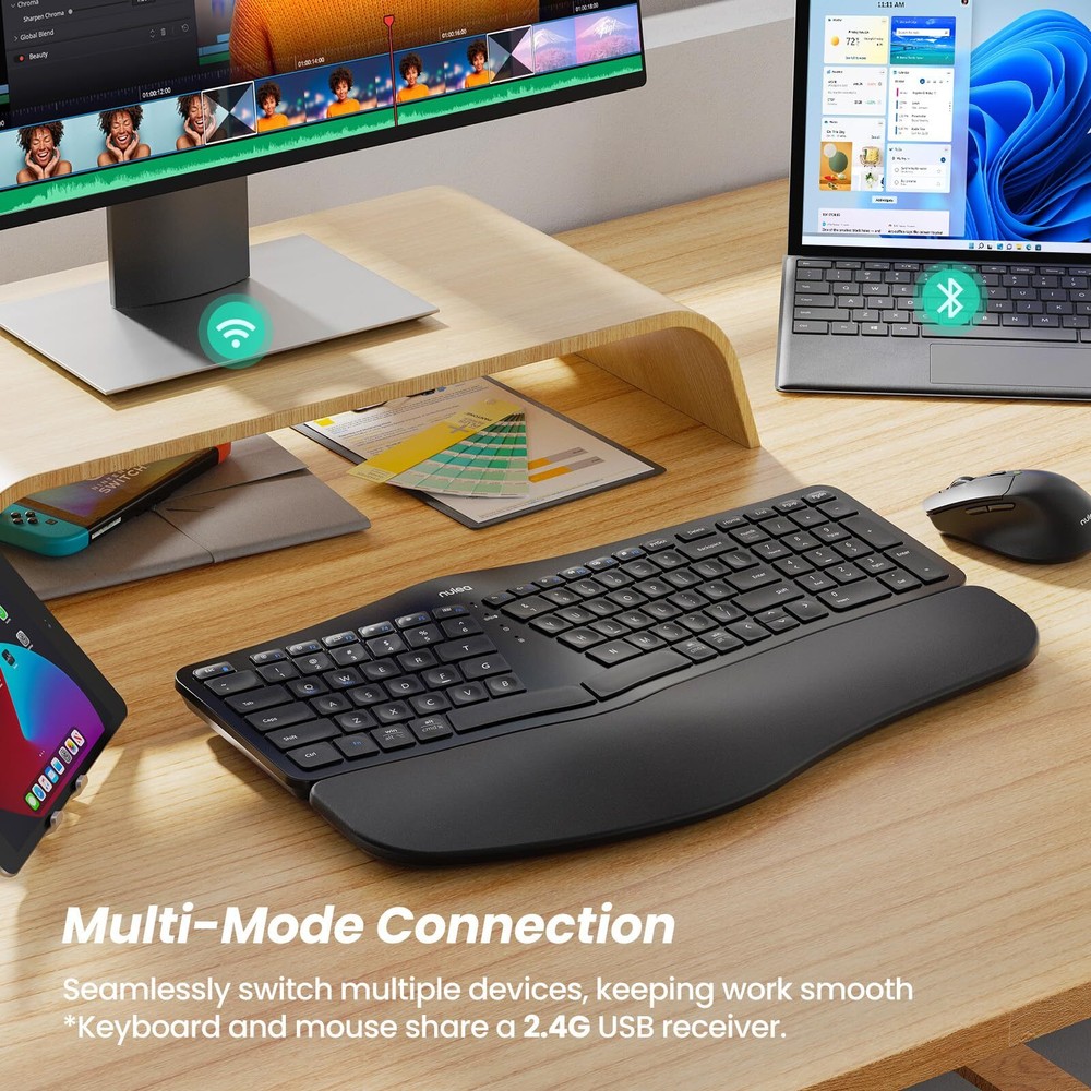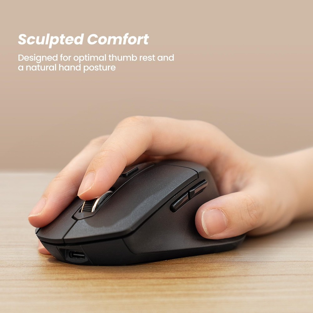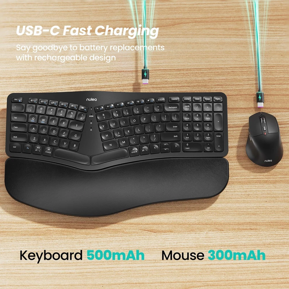 Multi-Device Connectivity: Seamlessly switch between up to three devices with our versatile connectivity options, including USB cable, 2.4G USB receiver, or Bluetooth. Effortlessly switch between devices with just a press of a button, compatible with Windows, Mac OS, and Android systems.(Tips: Keyboard and mouse share a 2.4G USB receiver.) Enhanced Wrist Comfort: Our keyboard includes a curved palm rest with a soft memory foam layer, offering superior wrist support and reducing wrist bending. Meanwhile, the adjustable tilt design allows for optimal positioning, ensuring your wrist remains relaxed and comfortable, whether you're seated or standing. Ergonomic Design Excellence: Experience ergonomic comfort with the wireless keyboard featuring a curved and split key-frame. This design helps position your wrists and forearms naturally, with scooped keys that match the shape of your fingertips for quick, responsive typing. Ideal for all-day typing sessions. Advanced Mouse Features: The ergonomic sculpt mouse is designed with integrated palm and thumb rests, enhancing wrist support and maintaining a natural hand position to minimize strain. Enjoy precise control with adjustable DPI settings and added forward or backward buttons for convenient web navigation. Rechargeable with Power Saving: Both the keyboard and mouse are equipped with high-capacity lithium batteries (500mAh for the keyboard, 300mAh for the mouse), rechargeable via the included USB-C cable. An auto-sleep mode activates after 30 minutes of inactivity, conserving power and extending battery life.