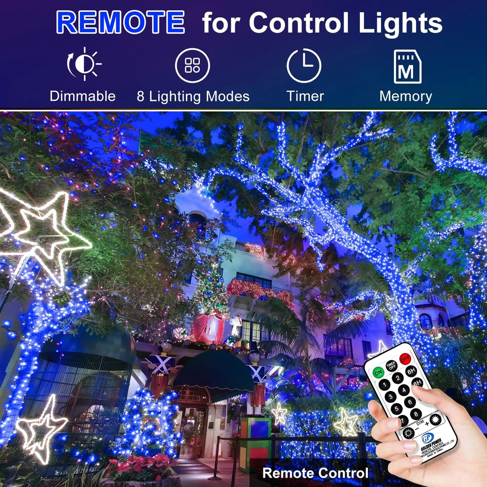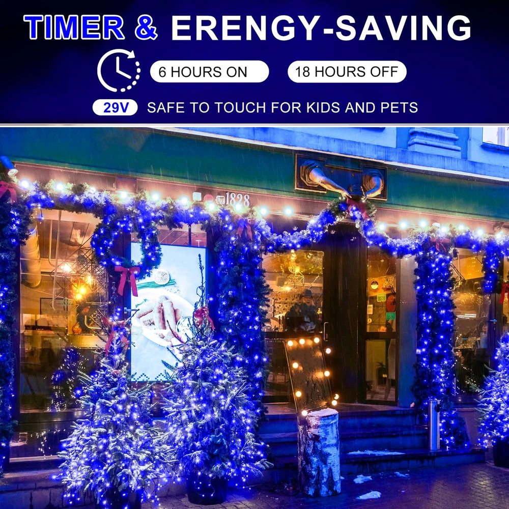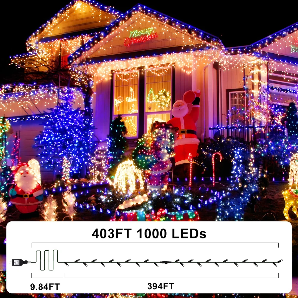 403FT Super Long and 1000LEDs Super Bright: The Green Wire Christmas lights length is 403ft with 1000LEDs beads, and 9.84ft plug cord, which can be enough to wrap around and decorate a 15ft Christmas tree, no need to extend, moreover green wire will blend well with the tree. Upgraded higher brightness LED bulbs make each LED beads shine 360 degrees but non-dazzling, to create a cozy, romantic and festive atmosphere for Christmas, Party, Wedding. As a holiday decoration, KNONEW Christmas string lights is really Excellent Value. Smart Christmas String Lights: Including 1 steady on +7 Variable Lighting Modes(Combination/In Waves/Sequential/Slo-Glo/Chasing/Slow Fade/Flash/Steady On). Stay away from single lighting mode! Whether you are hosting a lively gathering or enjoying a quiet evening under the stars, variable Lighting Modes allows you to set the perfect mood for any occasion. Safer and More Efficient: Christmas LED Lights is powered by 29V low voltage output Plug with UL certified, and Low-temp LED bulbs ensure no overheat after long time using. Very safety for kids and pets even can hold it or hang it on their bodies. The LED beads not only do they consume a fraction of the energy , but they also boast a longer lifespan, saving your both energy and money in the long run. It's a win-win situation that combines eco-friendliness with cost-effectiveness. Indoor Outdoor Used: Outdoor lights have IP44 waterproof rated, you can trust they hold up against stormy days, and provide reliable performance season after season. Kindly note the plug needs to be protected from water. Perfect for indoor and outdoor use, hang it into your yard,garden,patio,bushes,doorways,and bedroom,classroom,curtain,ceiling. Making you feel relaxed after exhausting work all day,and enjoy the peaceful moments at night. 4 Adjustable Brightness Levels and 3 Timer Function: Built-in timing and memory chip, no longer have to manually turn it on and off every day, and it will save your last mode setting or timer setting without reset. Saving your time. 100%-75%-50%-25% 4 level brightness adjustable, you can choose the brightness that makes you feel most comfortable. Super easy to install, plug-in and play, then hang it or place it anywhere you need. It`s a great gift for your family and friends.
