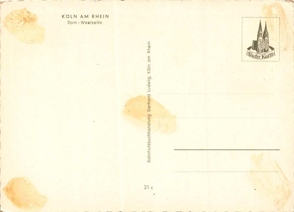 MAKE AN OFFER. THE MORE YOU BUY THE BETTER DEAL I WILL ACCEPT The postcard features an image of the west side of the Cologne Cathedral, known as Koln am Rhein in German. The postcard is from the Bahnhofsbuchhandlung Gerhard Ludwig, a bookstore located in Cologne, Germany.