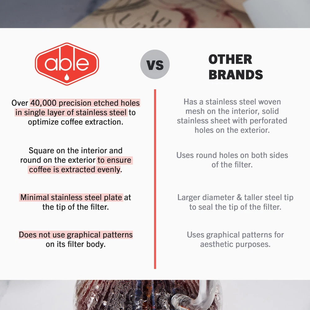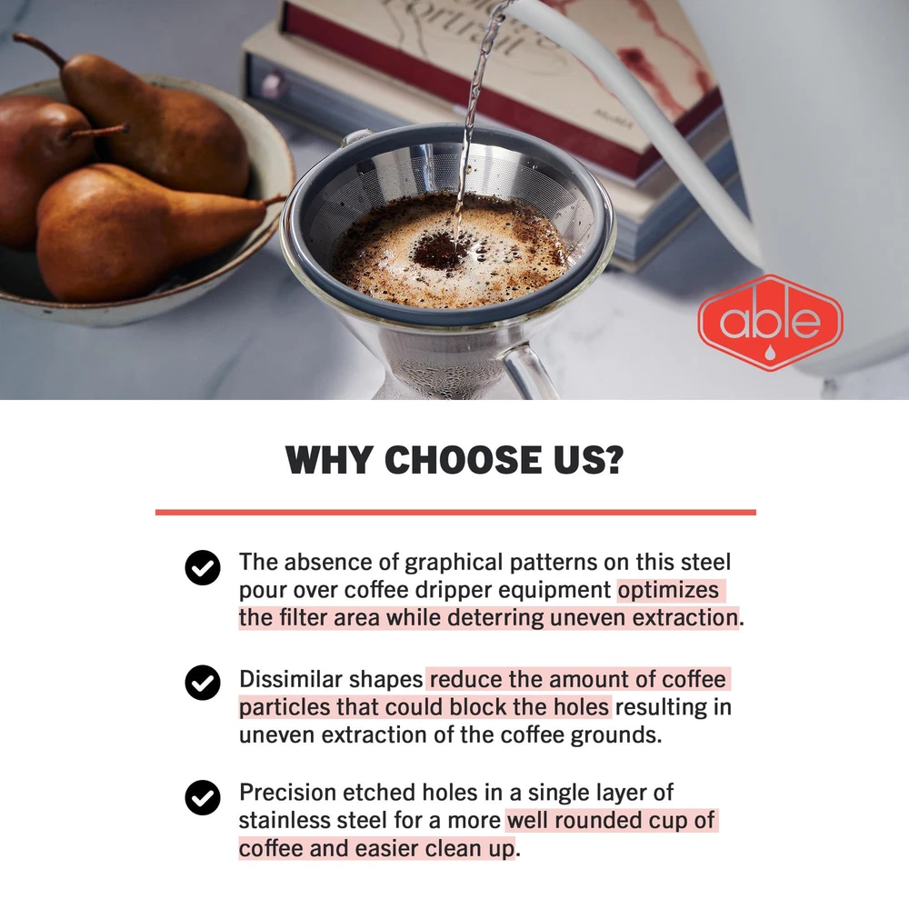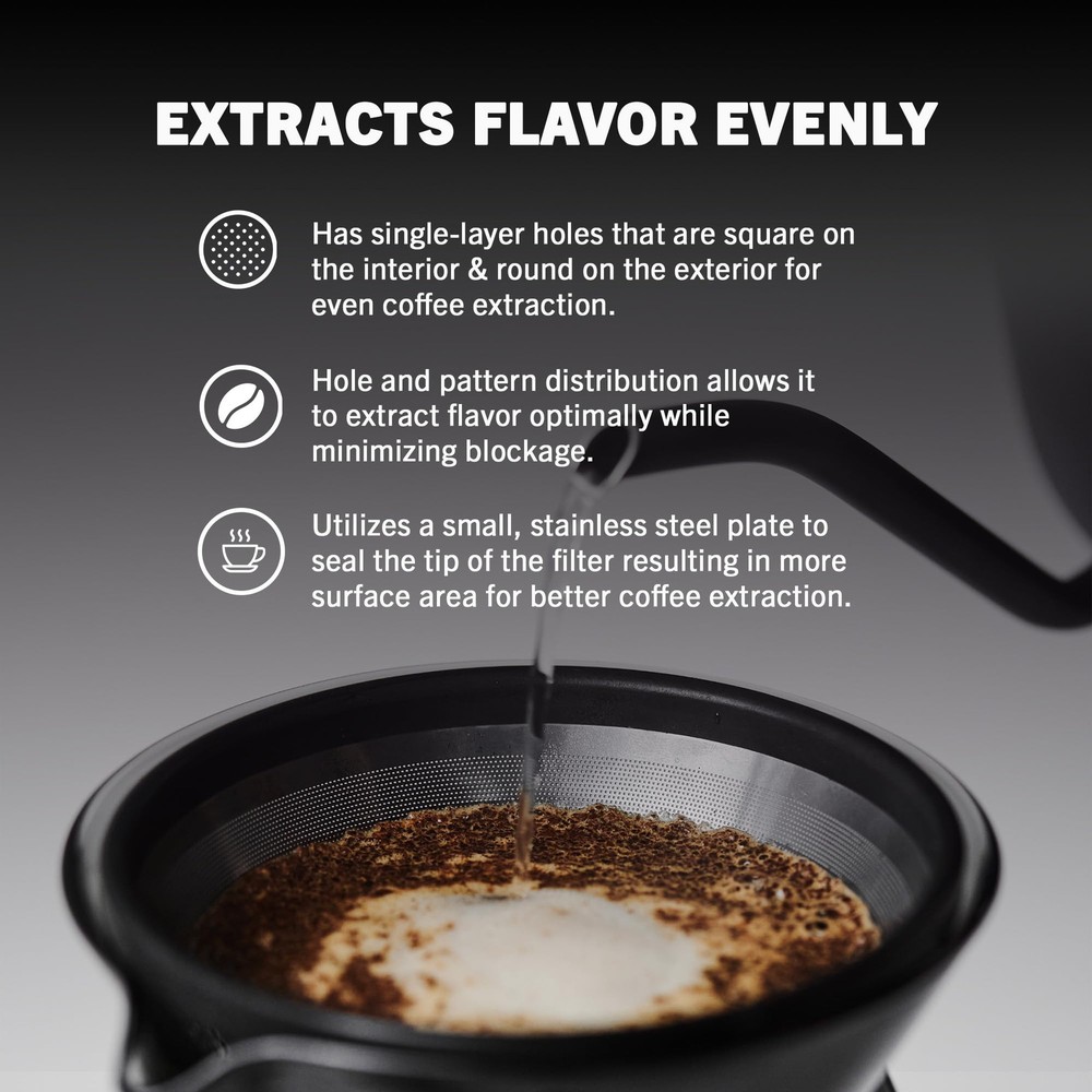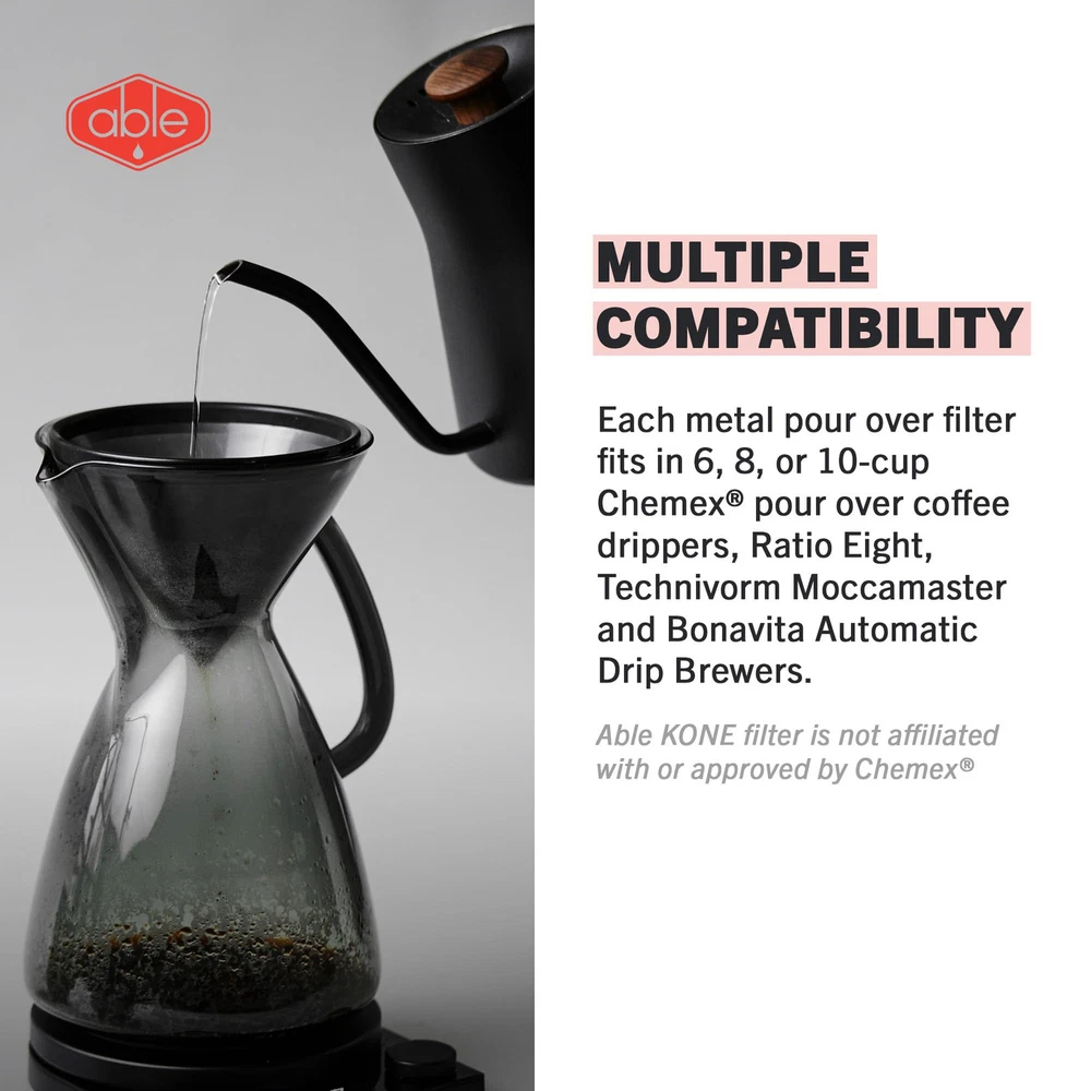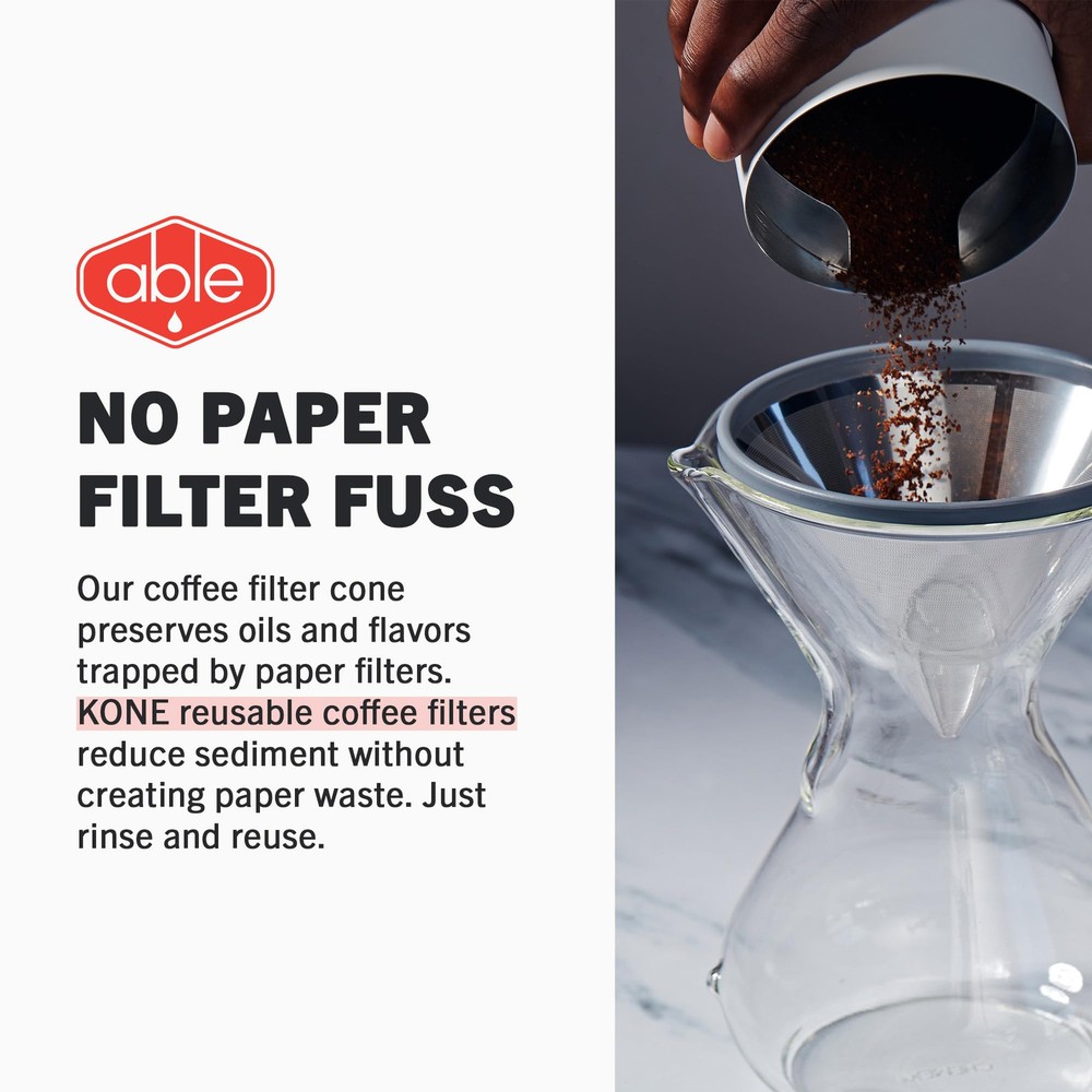 A PERFECT FIT YOUR CHEMEX - Brew cafe quality coffee without the fuss or waste of traditional paper filters. The Kone has been carefully engineered to make brewing delicious coffee at home a breeze, while living up to the rigorous standards of the best cafes. NO PAPER FILTER FUSS - The Kone brews a full-bodied cup of coffee, rich with oils and flavors normally trapped by paper filtration, and doesn’t impart unwanted flavors. And unlike paper filters, the Kone produces no paper waste. Simply rinse and repeat. METICULOUSLY ENGINEERED - Every last detail of the Kone has been painstakingly engineered to help you brew a delicious cup of coffee. Its singular design and unique features facilitate an even, controlled flow of water through the coffee grounds for better extraction and consistent flavor. BUILT TO LAST - Constructed from a single piece of precision welded, photo-chemically etched stainless steel and an injection-molded, food-safe polymer support ring, the Kone is built to stand up to the daily demands of the cafe. EASY TO CLEAN - A quick rinse and occasional scrub keeps the Kone in tip-top shape. Unlike other reusable filters made with cloth, mesh, and gimmicky construction, the Kone’s elegant, single-layer design prevents build up of oils and sediment.