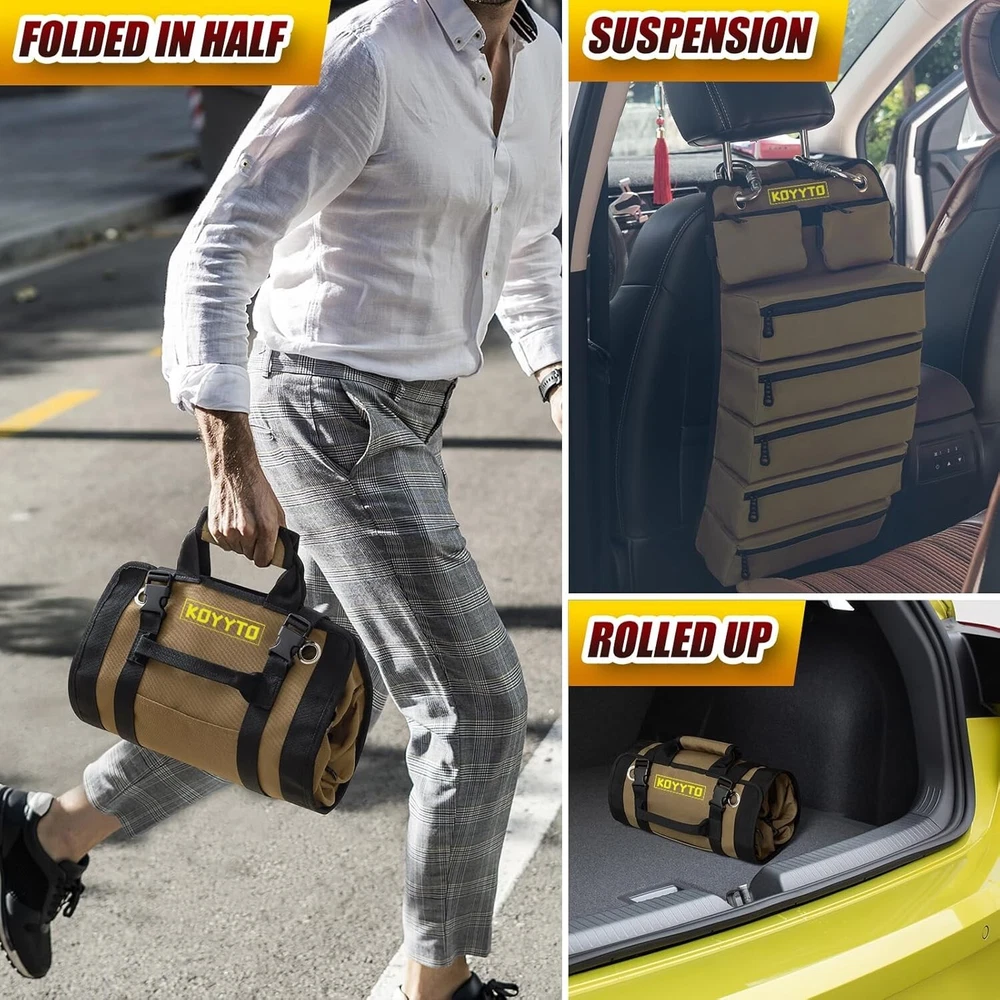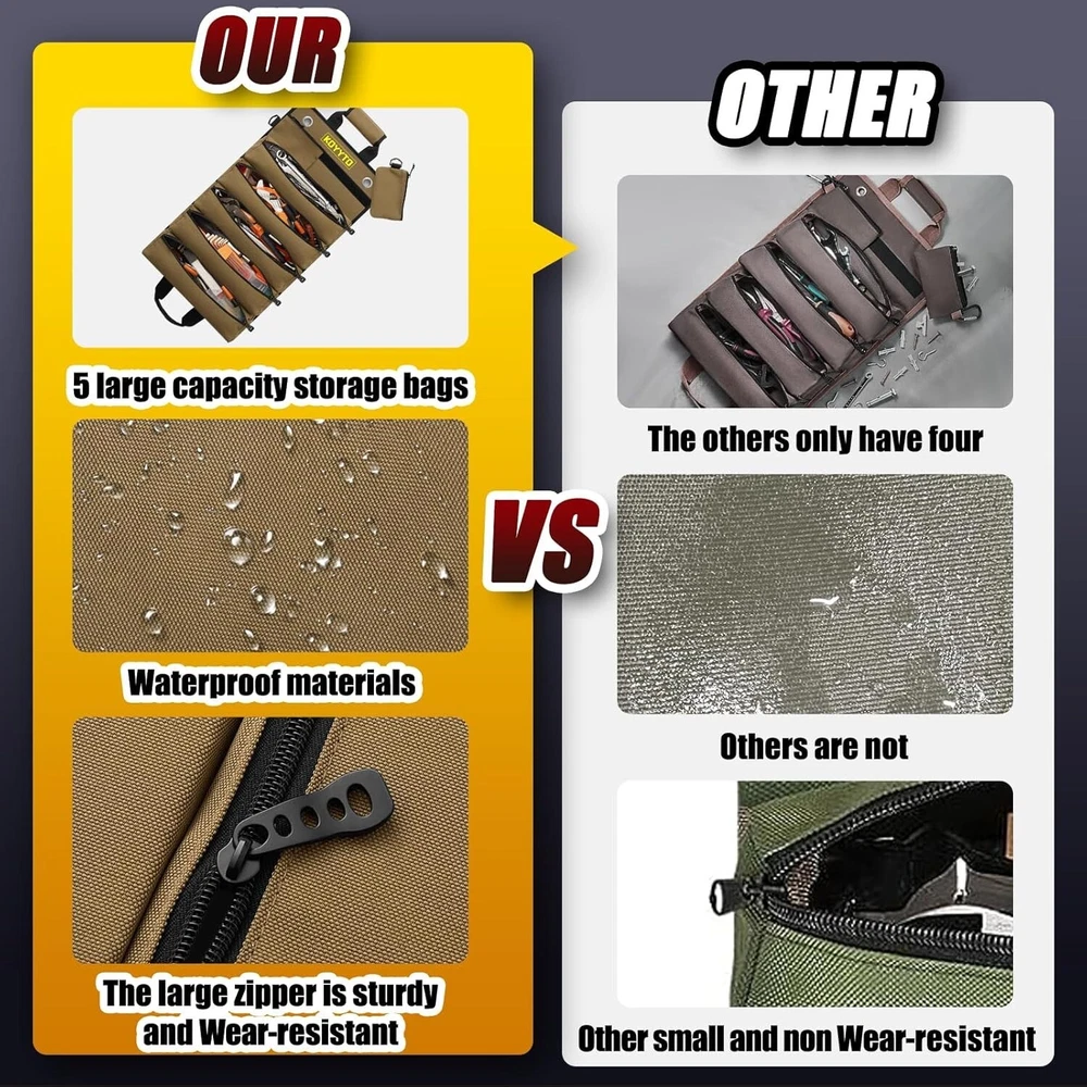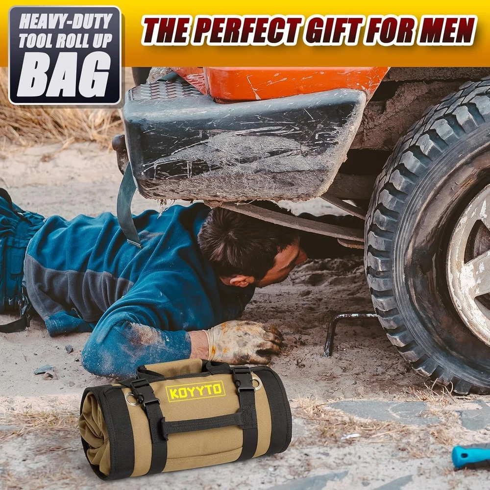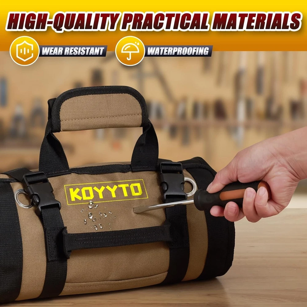Premium Tool Roll up Bag - Heavy Duty Small Tool Bag Organizer and Storage with W/Detachable Pouches,Waterproof Oxford Cloth,Suitable for Motorcycle,Truck,Electrician,Mechanics etc,Brown About this item The Gift for Men:This roll up bag would be a good assistant for carpenter, electrician, plumber, repairman,craftsman and so on.A Tool Roll Bag of Perfect Size. you’d Be Surprised by How Many Tools Fit in This Small Tool Bag Premium Waterproofing materials: This tool roll bag are made of upgraded Oxford Fabric,quality straps, buckles and well stitched edge which makes it wear-resistant and water resistant;lightweight and wear-resistant rust proof zippers Stay OrganIzed Bag Design:This tool roll bag has 5 fixed large zippered pockets to organize your small pillers, wrenches,screwdrivers, sockets, pliers and vice grip, tire gaugesor flat tools;2 removable pocket offer a better choice to separate small parts like gears, nails and sockets Quick and Easy to Organise and Unfold:You can bring necessary/emergency tools with yo,it is compact when you roll it up which saves a lot space for you;simply unroll the tool sleeve roll pouch and have access to all your tools Three Ways to Use: Our kit can be hung on the wall, rolled up or folded in half