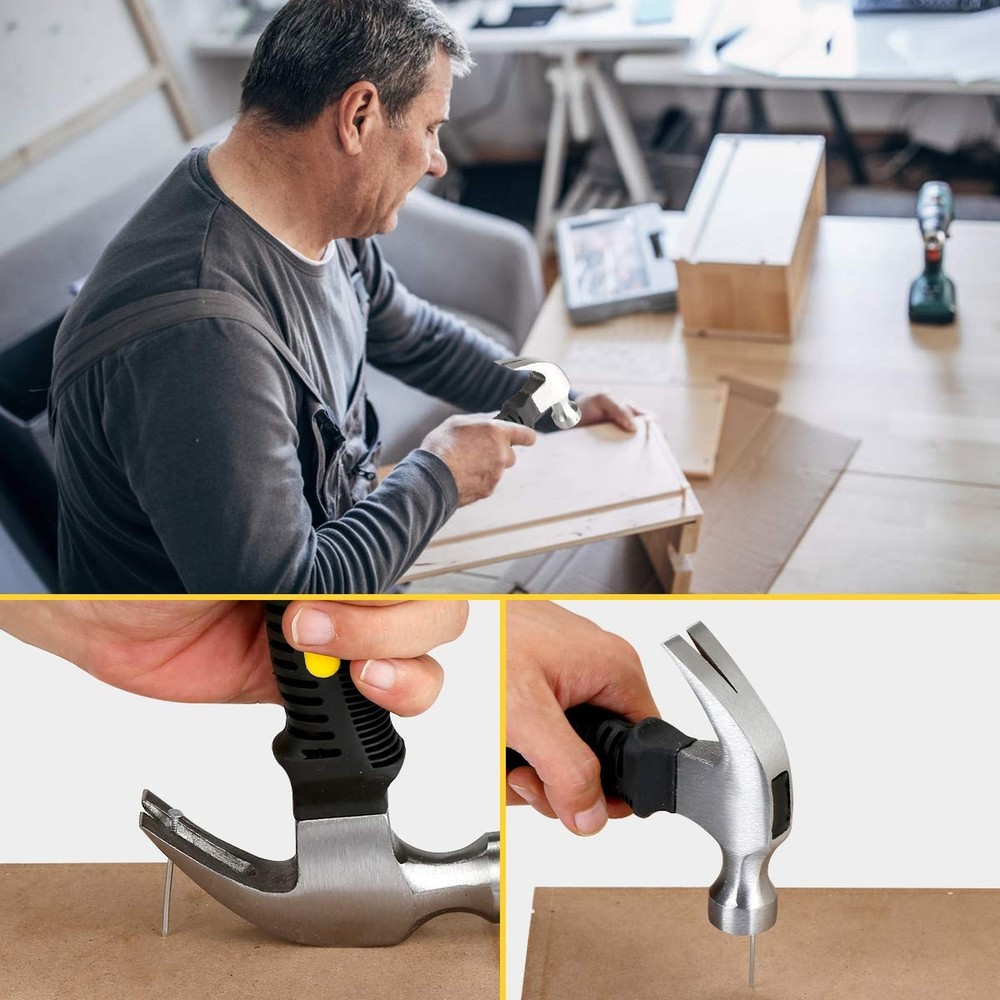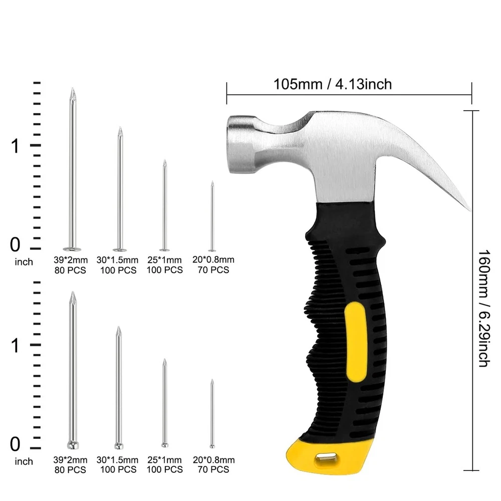 KURUI 700PCs Nails Assortment Kit & 8oz Hammer, Small Hammer for Hanging Wall Art Decor, Picture Frame, 350 Roofing/Wall Nails & 350 Finishing Nail Product Details Brand: KURUI Head Material: Carbon Steel Handle Material: Acrylic Color: Yellow Product Dimensions: 4.4"L x 1.1"W x 6.4"Th Brand: ‎KURUI Head Material: ‎Carbon Steel Handle Material: ‎Acrylic Color: ‎Yellow Product Dimensions: ‎4.4"L x 1.1"W x 6.4"Th Item Weight: ‎8 Ounces Grip Type: ‎Ergonomic Head Style: ‎Flat Style: ‎Portable,Ergonomic Number of Items: ‎561 Manufacturer: ‎Jerry UPC: ‎655887774980 Part Number: ‎S-1 Item Weight: ‎8 ounces Item model number: ‎1 Size: ‎Small Material: ‎Metal Item Package Quantity: ‎1 Measurement System: ‎inch Usage: ‎nails for hanging pictures Batteries Included?: ‎No Batteries Required?: ‎No Date First Available: April 29, 2020 HIGH-CLASS MATERIALS The 700Pcs hardware wall nails are all made from heavy-duty carbon steel and double galvanized for better anti-corrosive and anti-rust performance. The 8oz mini kids hammer consists of a hammer head forged of strong and robust carbon steel and a soft anti-slip TPR handle. The metal part of the hammer is specially processed to be rust-proof and durable, it is built to last tens of years. PRACTICAL ORGANIZER & ERGONOMIC HANDLE The nail assortment kit comes with a high-quality plastic organizer with 8 compartments for the 8 different nail types and sizes. Made of premium TPU, the handle of the stubby kids hammer is ergonomically designed and provides comfortable gripping experience. The special design also makes the handle shock-absorbent and anti-slip, which is friendly to ladies and children. RATIONAL SIZE ASSORTMENT You will receive 700pcs nails of different sizes and types: there are 350pcs galvanized picture hanging nails and 350pcs galvanized finishing headless nails in 0.75in,1in,1.18in,1-1/2in sizes. The mini hammer included in this set has excellent performance in various projects, especially in narrow spaces. Thanks to its compact size, the stubby women hammer is also perfectly portable. WHAT YOU GET There are 700pcs anti-corrosive galvanized hardware nails, 1pc precision-machined kids small hammer and 1pc 6.4"4.4"1.1" plastic organizer in the package. Kurui nail tool kit also comes with an 1-month free-return & refund service, KURUI proving you with satisfactory customer service and worry-free shopping experience.