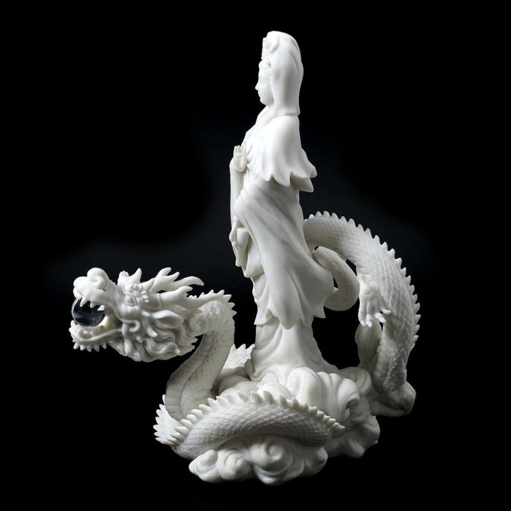 Kwan Yin on Dragon Statue Kwan Yin on Dragon Statue Click image to enlarge Description This beautiful statue is made from resin with crushed marble powder. It has exceptional detail and craftsmanship , and it is substantial with good weight. Detail Condition: Brand New Design: Kwan Yin on Dragon Material: Resin with Crushed Marble Powder Color: White Size: Approx. 12.5" x 7" x 10.5" Weight: Approx. 4 lbs Kwan Yin Pu Sa is the Buddhist Bodhisattva of compassion and mercy. Her name translates to 'she who hears the cries of the world'. She is beloved and worshiped in Buddhist communities worldwide for her unconditional love of humanity. Here she is seen riding upon a dragon as the 'Bodhisattva of the Southern Sea' and patroness of fisherman. SEE OUR ENTIRE SELECTION OF BEAUTIFUL KWAN YIN STATUES IN THE KWAN YIN SECTION OF OUR STORE. Shipping Shipping charges calculated to location. International Buyers International shipping charges are calculated to location in the 'Shipping and Payments' tab near the top of this page. Import duties, taxes, and charges are not included in the item price or shipping cost. These charges are the buyer's responsibility. Please check with your country's customs office to determine what these additional costs will be prior to bidding or buying. 'International First Class Mail' can take up to 6 business weeks for delivery depending on destination country, destination customs, and local or origin peak holiday shipping season. Faster 'International Priority Mail' shipping options are also available at checkout for most items. About Us The Tiny Dragon is a U.S. owned and operated 'e-retail' company. Our mission is to provide unique and affordable items of quality, promptly delivered to your complete satisfaction. Our items are shipped directly to you from our headquarters in beautiful Portland, Oregon USA. View our entire inventory at: At 'The Tiny Dragon' you are a valued customer and it is always our pleasure to serve you.