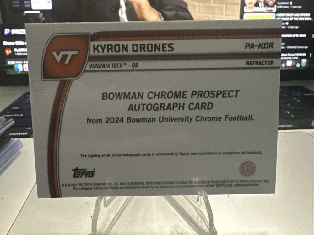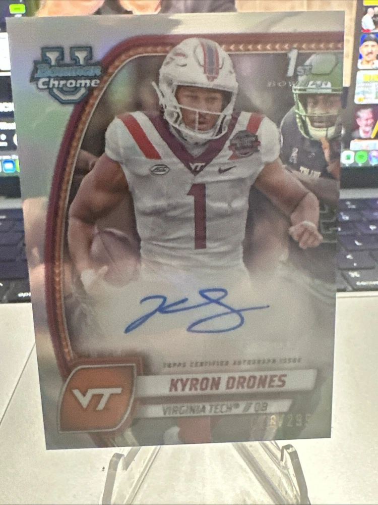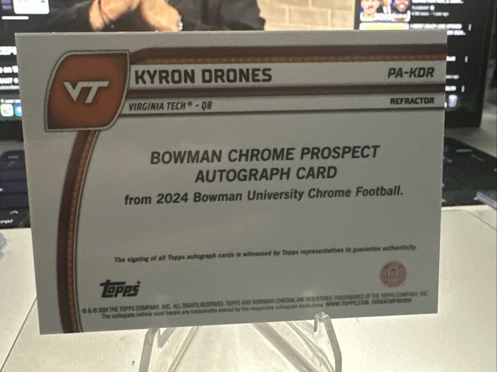 Kyron Drones autographed 2024 Bowman University Chrome football card, featuring a Chrome Refractor parallel variation. This limited edition card is serial numbered 76/299 and is a 1st Edition Rookie card for Kyron Drones of the Virginia Tech Hokies. The autograph is authenticated by Topps and the card is made of 35 Pt. card stock.