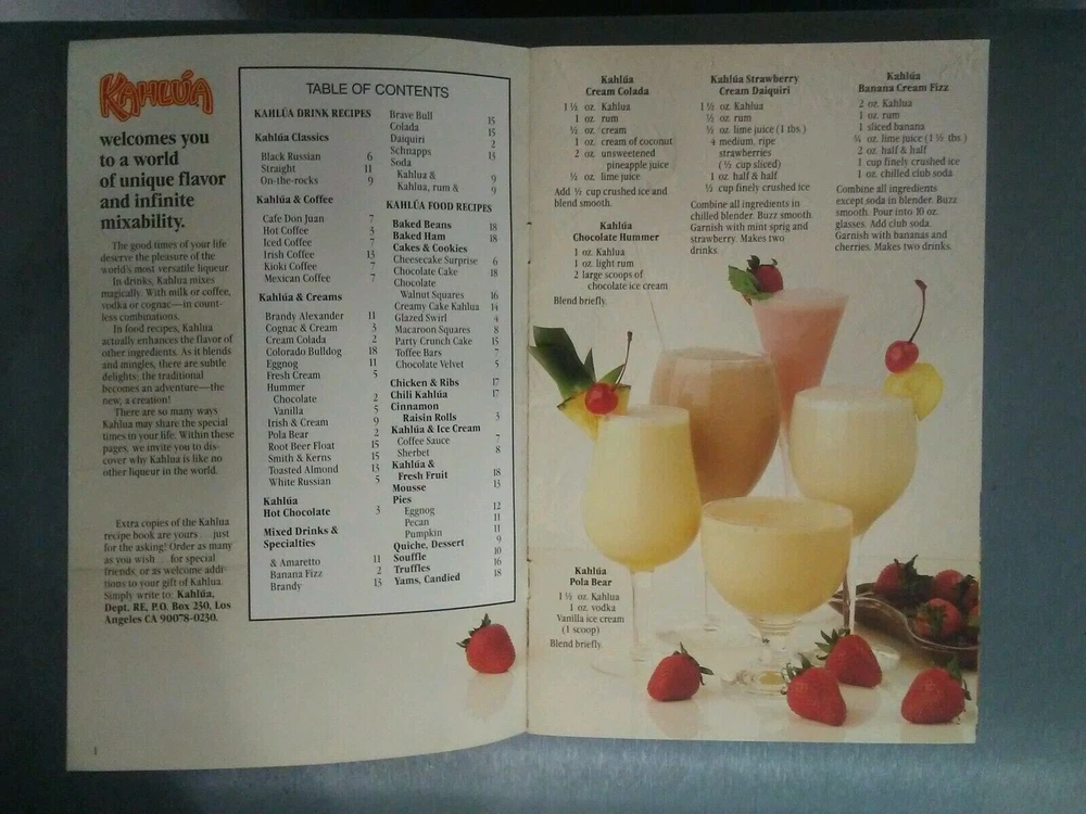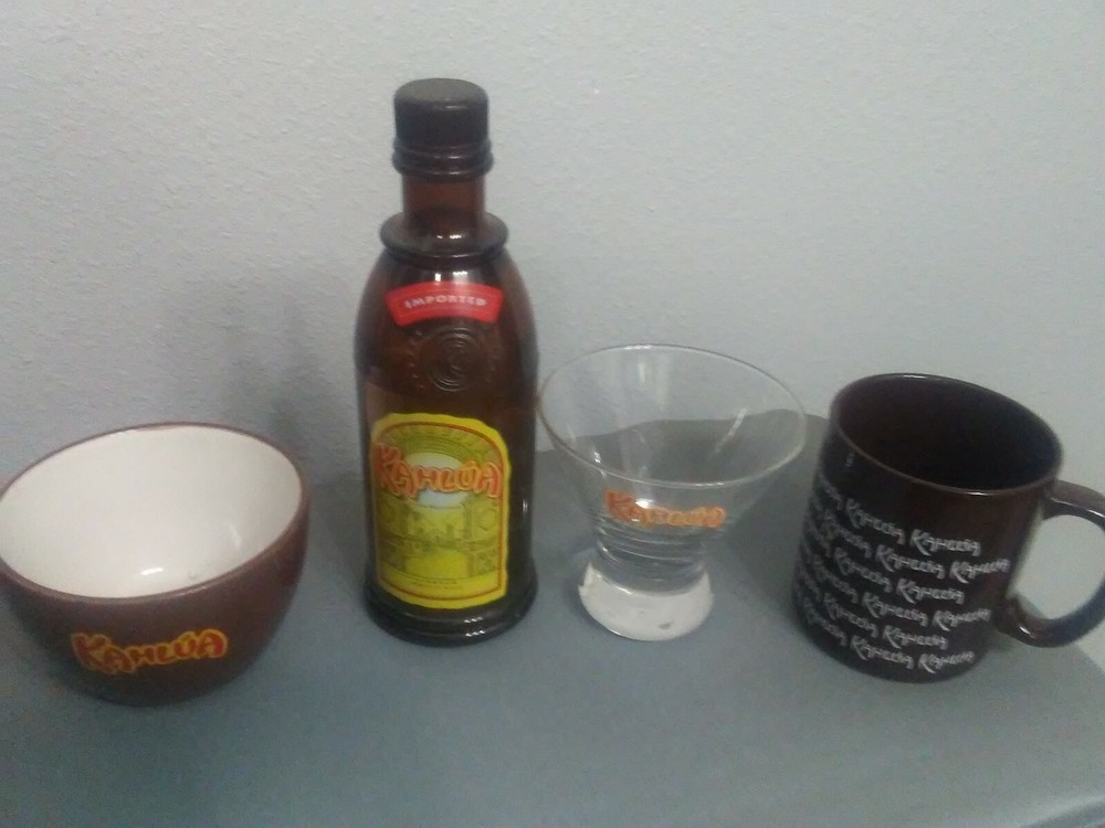 1.Kahlua Brown Ceramic Rice Soup Bowl 4 1/4" Dia. Dishwasher and Microwave safe 2. nice hard plastic new cocktail shaker - nice addition to raffle basket or theme party or shake up your white Russian or kahula chilled. 3. Kahlua The Everyday Exotic Glass 4. Kahlua Coffee Mug - Kahlua White Letters Logo Cup - Brown Mug w/ White Lettering 5. very rare original 1980`s Kahlua recipe cook book 18 color pages 5 1/2 x 8 1/2 smoke free home, great condition !!! 5 great & rare items for any Kahlua fan !!!