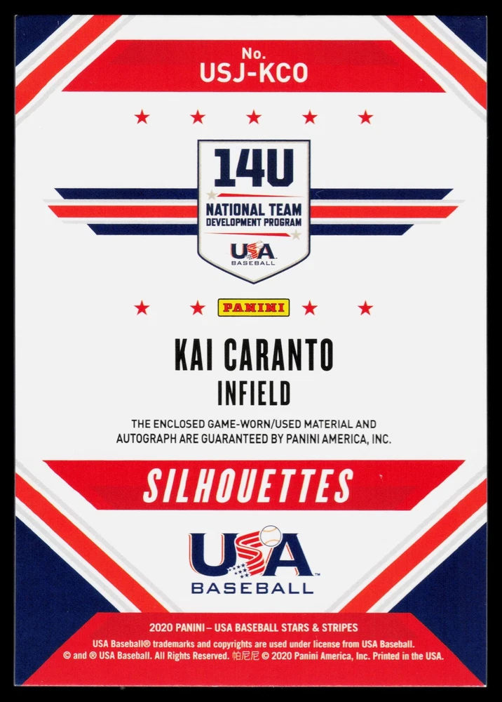 You will receive a Near Mint or Better, Kai Caranto, 2020 Panini Stars & Stripes, RPA /199, USA card PLEASE NOTE: SOME CARDS THAT GO THROUGH OUR SCANNER MAY APPEAR TO HAVE LINES THROUGH THEM. THEY ARE NOT ACTUAL SCRATCHES, SIMPLY FALSE IMAGE LINES. WE WILL NOT INTENTIALLY SELL, DAMAGED CARDS. NEW CARDS LISTED DAILY ORDERS SHIP NEXT DA Y (Weekends as mail service is available) VISIT OUR STORE FOR MORE DEALS! USE THE SEARCH ICON IN THE STORE TO FIND YOUR FAVORITE TEAMS & PLAYERS! Be sure to save us as sellers to be the first to be notified when new and exciting cards are posted! Please note, we are not professional graders, and the condition of the card you purchased is highly subjective. Please refer to the high quality scans of the card you are viewing, and determine the condition of the card for yourself. Feel free to reach out with questions! All cards are in EX-NM+ condition, unless stated otherwise Chrome cards from various brands might have minor light surface scratches, which is typical with these type of cards. Any major, deep scratches or major surface issues will be noted, if present. We take pride in the condition of all of our cards, including commons. Our promise to you, is that we will not sell a card we would not buy ourselves. Of course things slip by, however customer service is our #1 Priority, and we are always here for a message for ANY, and ALL issues. Thank you very much for stopping by, feel free to reach out! - Titan (Son) & Andy (Dad)