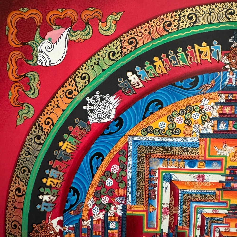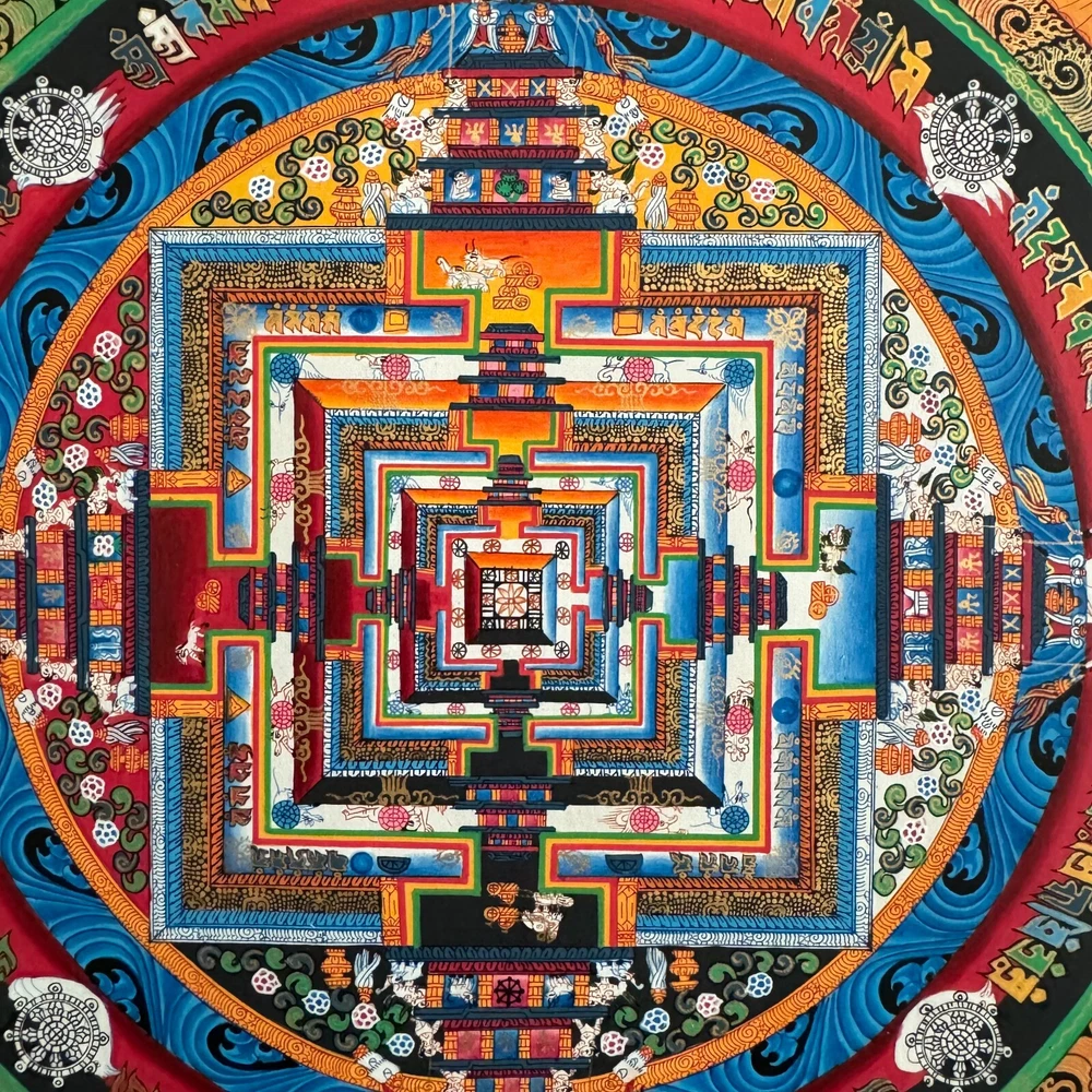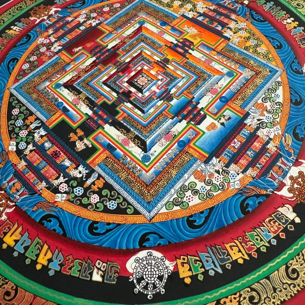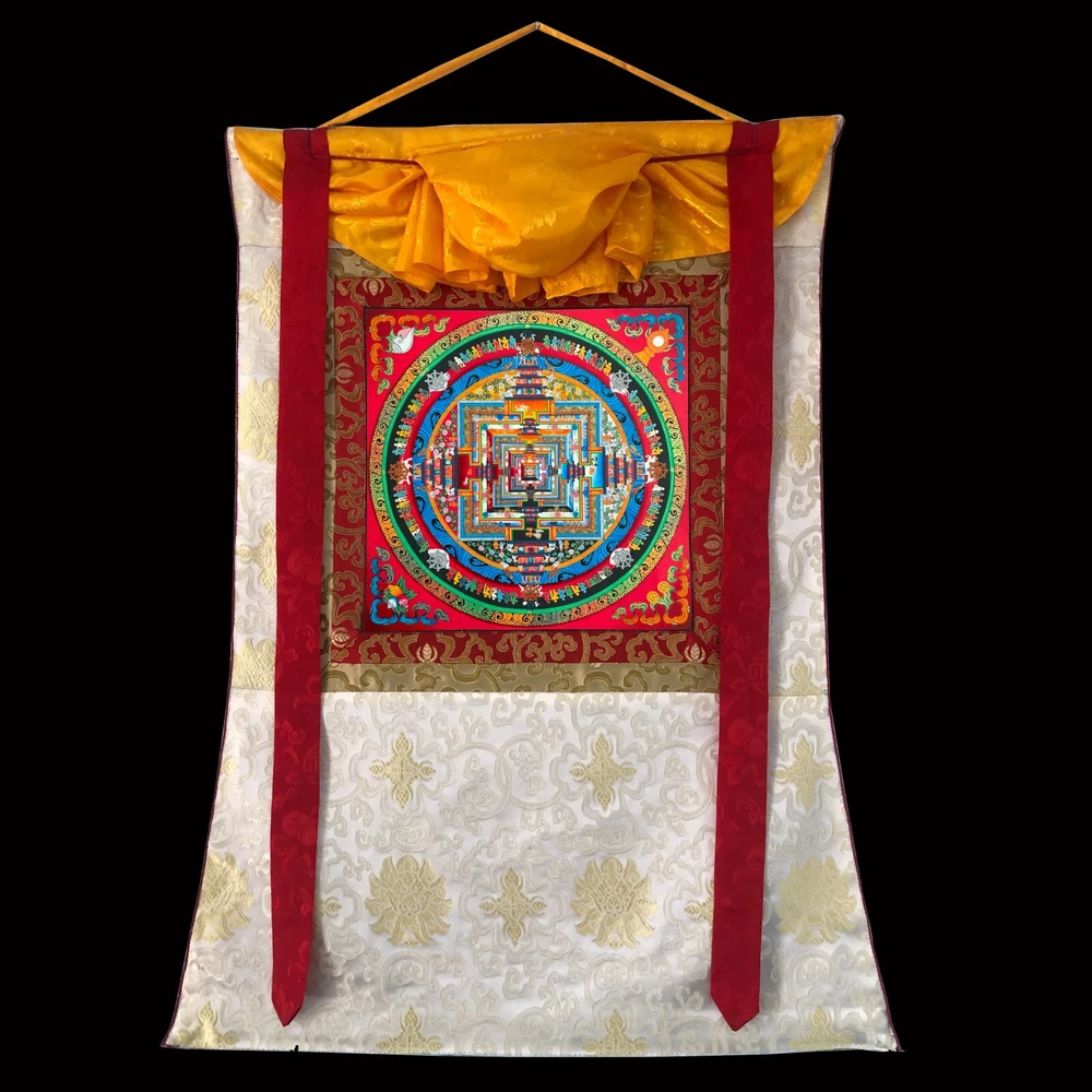 Namaste and Welcome to my Gallery!!! All of the paintings and arts in my gallery are originally handmade and hand-painted by my family members and other local artists who have been practicing their craft for over two decades. My father is Master Artists Nepal with an experience of more than four decades; you can see some of his work in this Gallery. Also you can see some of the beautiful and soulful artwork of talented local artists from Himalayas. ~~ Kalachakra Mandala Thangka~~ Kalachakra Mandala is a Sanskrit word for “wheel of time”. The mandala of kalachakra is aerial view of the kalachakra temple, situated in Lhasa and contains 722 Deities, and at its heart on a Lotus flower, a single Buddha: Kalachakra. It is a 5 level structure, each level is represented by a square, and each square is set within the others. In mandala there are six circles of elements: wisdom, space, wind, fire, water and earth. Then we get to different entrance of the body, speech and mind. The Dalai Lama and the Kalachakra Although thought to have once been a carefully guarded secret of the Shambhala Kingdom, the Kalachakra Tantra is now widely known. The Dalai Lama himself has given thirty-three separate initiations into this practice all over the world, including in Tibet, India, Switzerland, Canada, and the United States. In an essay on his website, His Holiness writes, “the Kalachakra initiations empower the disciple to practice the yoga of the Kalachakra tantra, and, ultimately, to achieve the state of Shri Kalachakra.” As with other mandala practices, the goal here is for the initiate to “enter” into the mandala and identify with the deity represented therein. The Kalachakra Mandala Through meditation on the Kalachakra mandala, monks invoke the qualities of the deity, striving in a ritualized way enter the mandala and become the deity themselves. This practice is not usually public, and mostly occurs behind temple walls. The floors of the palace depicted in the Kalachakra Mandala, from the ground up, represent: 1) Enlightened body 2) Enlightened speech 3) Enlightened mind 4) Enlightened wisdom 5) Enlightened great bliss Arrayed around the palace are four elemental rings and two outer rings. From the inside out they are: 1) Earth 2) Water 3) Fire 4) Wind 5) Space 6) Wisdom Taken together, all of these elements compose a microcosm of the universe, ruled by time personified. Size = 76cm x 63cm Material Used: • Cotton Canvas • Natural Pigments and colors • Gold leaf • Silk Fabric ~Excellent for meditation or home/office decor, ~Tibetan Yoga Wall Art ~Genuine 100% hand-painted from Himalayas Please feel free to contact me if you have any question regarding the painting.