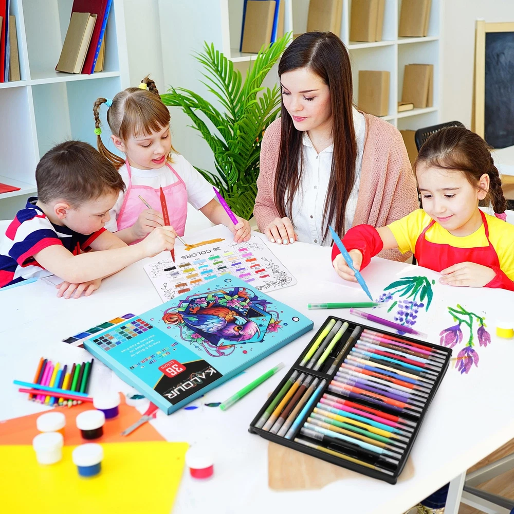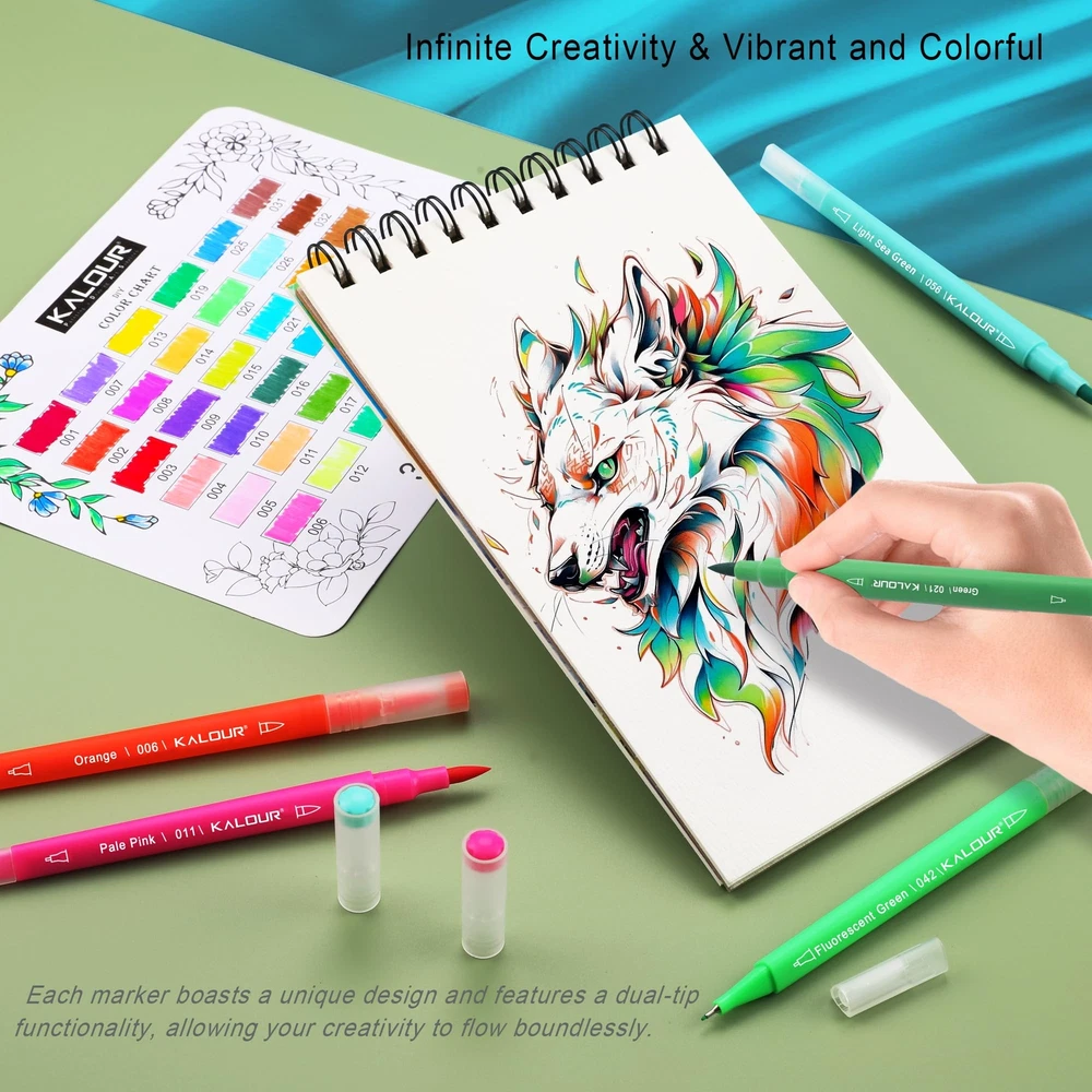 Kalour Dual Markers Brush Pens, 36 Fine Point Art Marker, Double Tip Colored Pen for Adult Coloring Hand Lettering Writing Planner 36 VIBRANT COLORS:Explore a rich palette of 36 vibrant colors, providing endless possibilities for your artistic creations.Ideal for a multitude of artistic pursuits:Hand Lettering,Coloring Books,Signing,Design,Art Projects,Planning & Journaling,Manga & Animation. BRUSH & FINE POINT DUAL TIPS:Experience the versatility of dual tips – BRUSH for sweeping strokes and blending, FINE POINT for intricate details like sketching and writing. COLOR NAME & NUMBERED:Effortlessly find your desired color with color name and numbered markers. The included DIY color chart allows you to match each marker to its corresponding block for easy reference during your creative process. SMOOTH FLOW, HIGH-QUALITY INK:Enjoy the benefits of high-quality water-based ink that flows smoothly. The ink's vibrant colors seamlessly blend, providing beautiful and consistent coloring effects without smudges. MULTIFUNCTIONAL & SUITABLE FOR ALL AGES:Ideal for various artistic pursuits such as drawing, lettering, coloring books, and sketching. Perfect for individuals of all ages, making it an excellent gift for artists, students, and creative enthusiasts. PORTABLE CASE:Housed in a case, these markers are perfect for creativity on the go. The organized case ensures that your vibrant, no-bleed markers are always at your fingertips.