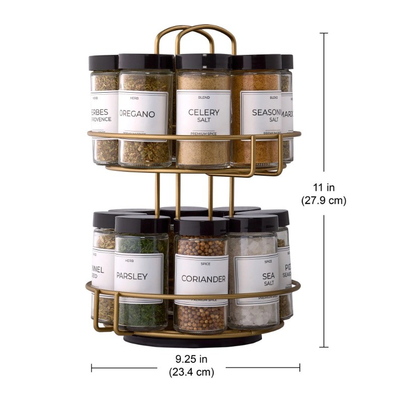 The Kamenstein 16-Jar Revolving Spice Rack includes 16 spice jars with removable sifter discs, and 1 revolving chrome wire spice rack organizer that complements your kitchen decor. Spices include Basil, Bay Leaves, Celery Salt, Chives, Coriander, Crushed Mint, Fennel Seed, Herbes De Provence, Italian Seasoning, Marjoram, Oregano, Parsley, Pizza Seasoning, Rosemary, Sea Salt, and Seasoning Salt (spices may vary). The rotating design keeps spices neat and easily accessible on countertops or in cabinets. Each jar features an easy-to-read label identifying the spice and a removable sifter cap to easily sprinkle, scoop, or pour your desired amount. The built-in handle provides easy transport around your home. Spice rack with spices included are Basil, Bay Leaves, Celery Salt, Chives, Coriander, Crushed Mint, Fennel Seed, Herbes De Provence, Italian Seasoning, Marjoram, Oregano, Parsley, Pizza Seasoning, Rosemary, Sea Salt, and Seasoning Salt (spices may vary) Rotating spice rack for cabinets and countertops keeps your spices neat and easily accessible Each glass jar features an easy-to-read label identifying the spice, and a removable sifter cap to easily sprinkle, scoop, or pour your desired amount Seasoning organizer measures 7.5 x 9.25 x 11in Features a built-in handle for easy transport around your kitchen and home