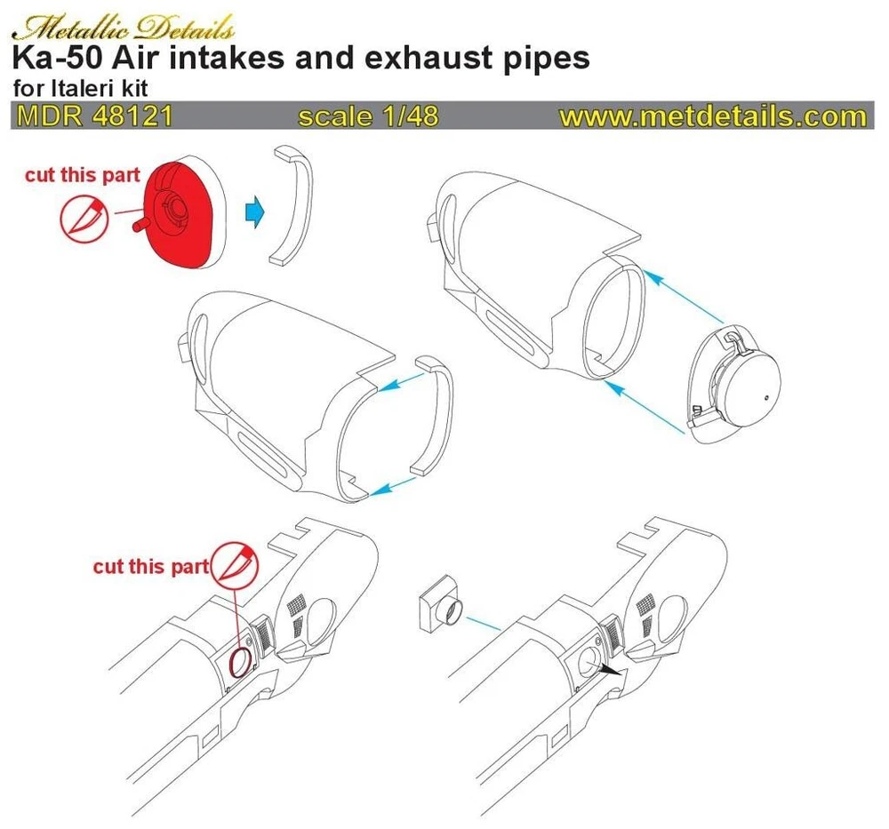 Kamov Ka-50. Detailing set Air Intakes and Exhaust Pipes (Resin) Scale 1:48 (Recommended for kit: Italeri/Revell) Metallic Details MDR48121 - For Helicopter Kit Model Set contains resin parts for Detailing of Turbine Air Intakes and Exhaust Pipes for the Helicopter Model Kits Ka-50 (Italeri/Revell). Type aircraft or vehicle: Kamov Ka-50 Attention! The Helicopter is not included in the set. Only the Upgrade Set! Scale: 1:48 Manufacturer: Metallic Details (Ukraine) Model (SKU): MDR48121 Country/Region of Manufacture: Ukraine Condition: New in Box Product specifications Material: Resin parts Type: for Models Helicopter Kits Features: Kit Kit description: Unpainted, Unassembled, Kit do not contain paints and glue Equipment Type: Exterior Details, Jet nozzels Recommended kit: Italeri/Revell The Kamov Ka-50 Black Shark (NATO: Hokum A) β a single-seat attack helicopter with the distinctive coaxial rotor system of the Kamov design bureau. Produced: 1990 β present. Operators: Egypt, Russia. ------------------------------ Discover Scale Modeling Like Never Before! π Visit Our eBay Store! π Explore Our Collection Now! Step into the extraordinary world of scale modeling with our premium selection of scale model accessories , crafting supplies, and tools. Whether you're a seasoned modeler or just starting, we offer everything you need to create lifelike replicas of automobiles, aircraft, ships, and trains. Elevate your projects with: π¨ Miniature Components for added realism. π οΈ Precision Tools to craft every detail flawlessly. π‘ Supplies designed to unleash your creativity. Let your imagination soar with the best in scale model craftsmanship! π About Us ποΈ We provide a wide selection of 100% brand-new products at competitive prices βdirect from manufacturers to you. π¬ Need help? We're always here to assist you! βοΈ Enjoy a simple, secure, and worry-free shopping experience. π³ Payment π΅ All eBay payment methods accepted, giving you convenience and flexibility. π‘οΈ Transactions are protected by eBayβs Buyer Protection Program for your peace of mind. π Shipping Details βοΈ Fast & Reliable Shipping : Orders are shipped via trusted airmail services and delivered by your national postal service. π¦ Tracking Included : Monitor your package every step of the way. Shipping from Ukraine . Estimated delivery: 10β25 days . Handling time: 1β5 business days . π Shipping Discounts π° Save more with combined shipping discounts ! 50% off shipping for each additional item. π§ Request an invoice before payment for an updated total. π Hassle-Free Returns π Not satisfied? No worries! β Refunds issued promptly upon receipt of the item in its original condition. π― Shop with confidence and craft your perfect models today!