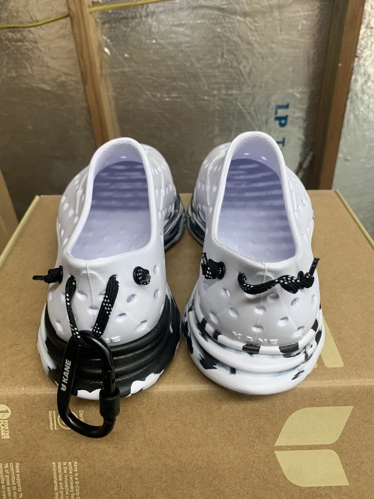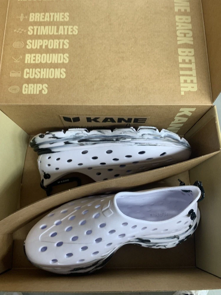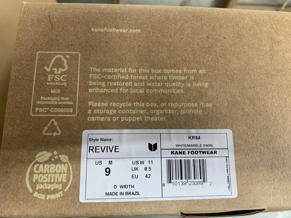 Brand new with box Men's size 9, Women's size 11 All sales are final, no returns Fast shipping! KANE Revive shoes are made of bio-based closed-cell RestoreFoam™. The shoes don’t absorb moisture, so they’re just as functional in water as they are on land, and they’re quick-drying. The KANE Revive shoes can easily be wiped or washed off with soap and water. Please avoid exposure to extreme heat or sun for this can cause the shoes to shrink or warp. Dishwashers, washing machines, or hot cars can also cause the shoes to shrink or warp. The KANE Revive sizing follows the standard sizing for a running shoe. Therefore, the size guide should be utilized according to your typical running shoe size. IN BETWEEN SIZES? We recommend sizing down (ex. if you typically wear size 10.5 - select size 10). For a wider foot, go one half size up (ex. if you typically wear size 10.5 - select size 11).