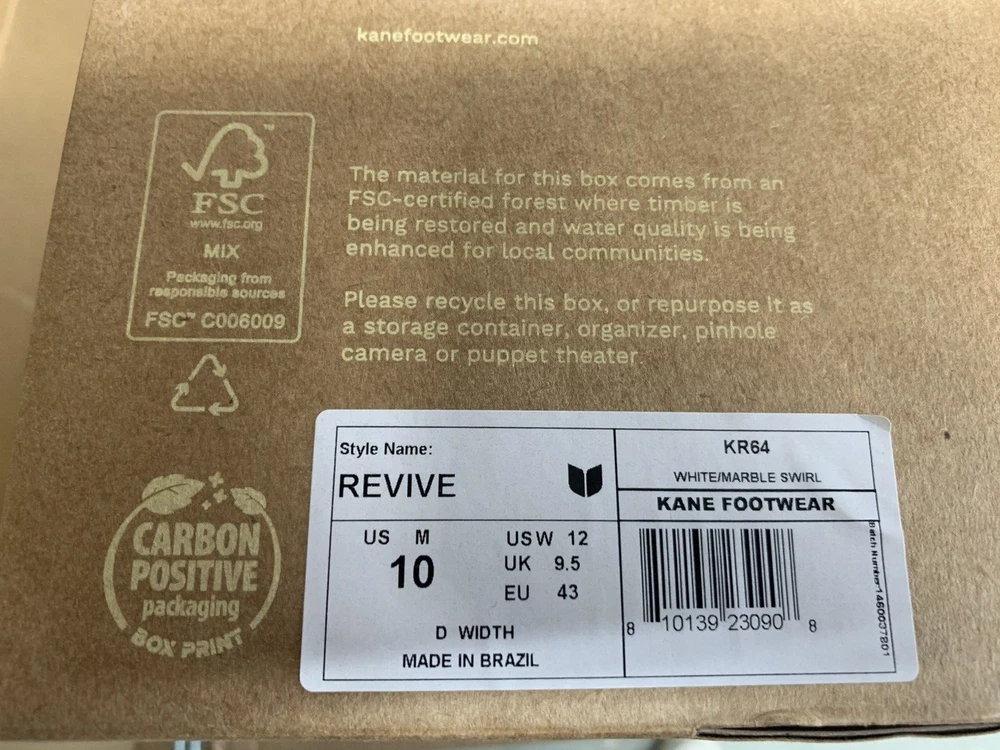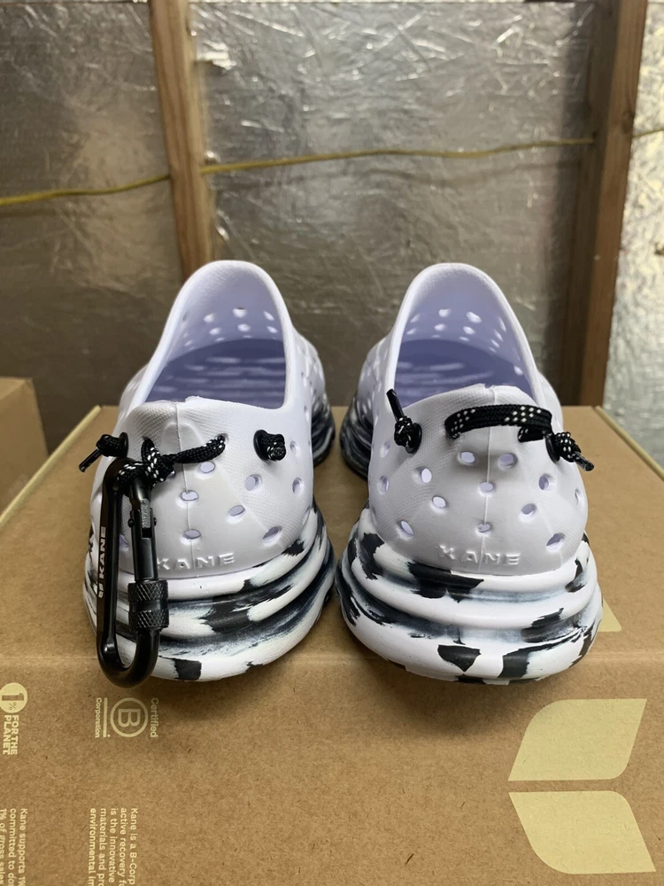 Brand new with box Men's size 10, Women's size 12 All sales are final, no returns Fast shipping! KANE Revive shoes are made of bio-based closed-cell RestoreFoam™. The shoes don’t absorb moisture, so they’re just as functional in water as they are on land, and they’re quick-drying. The KANE Revive shoes can easily be wiped or washed off with soap and water. Please avoid exposure to extreme heat or sun for this can cause the shoes to shrink or warp. Dishwashers, washing machines, or hot cars can also cause the shoes to shrink or warp. The KANE Revive sizing follows the standard sizing for a running shoe. Therefore, the size guide should be utilized according to your typical running shoe size. IN BETWEEN SIZES? We recommend sizing down (ex. if you typically wear size 10.5 - select size 10). For a wider foot, go one half size up (ex. if you typically wear size 10.5 - select size 11).