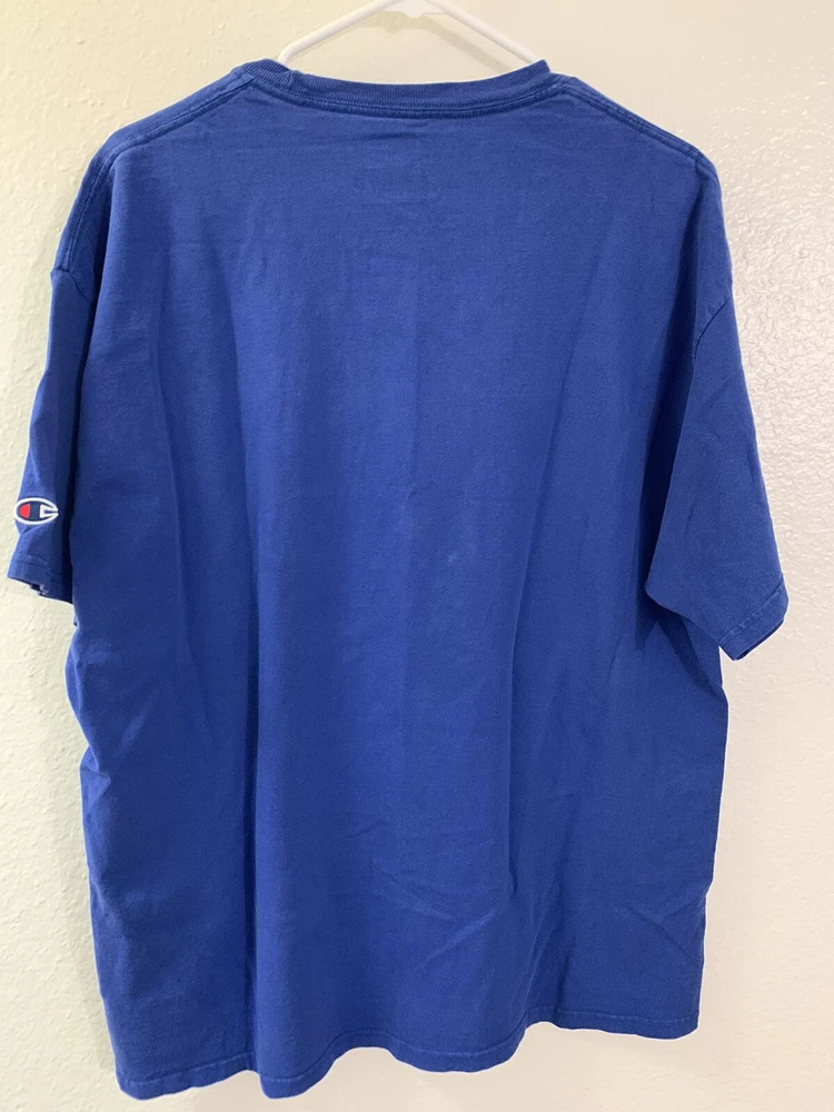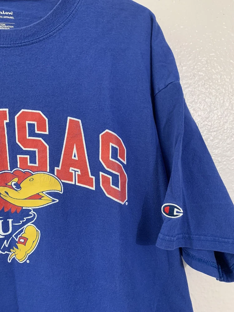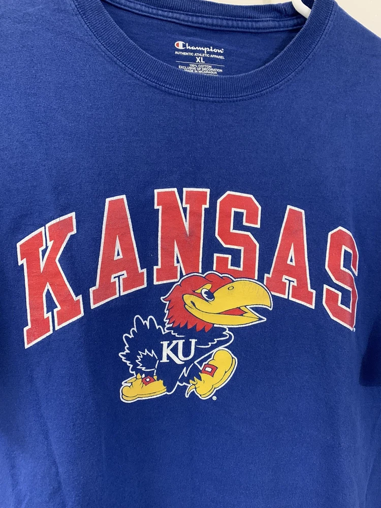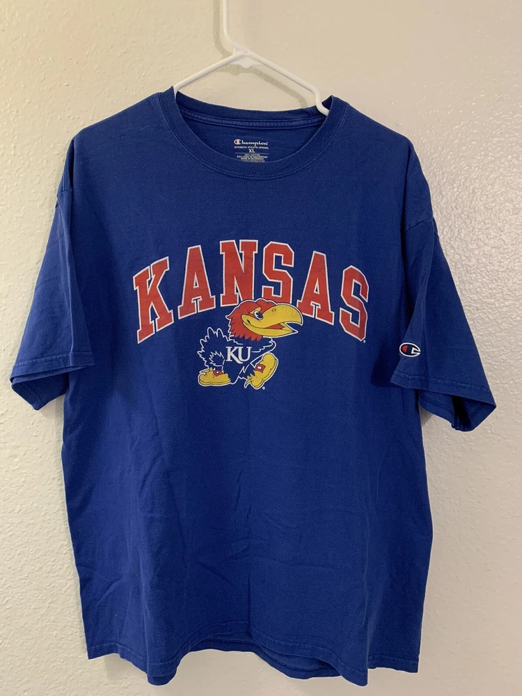 Show your support for the Kansas Jayhawks with this Champion XL blue shirt. Perfect for football season, this officially licensed fan apparel is a must-have for any dedicated fan. Featuring the team's logo and colors, this shirt is a great addition to your collection. It's made for men and comes in size XL, making it a comfortable fit. The shirt is from the brand Champion, known for their high-quality sportswear. Wear it to the game or just around town to show your team pride.
