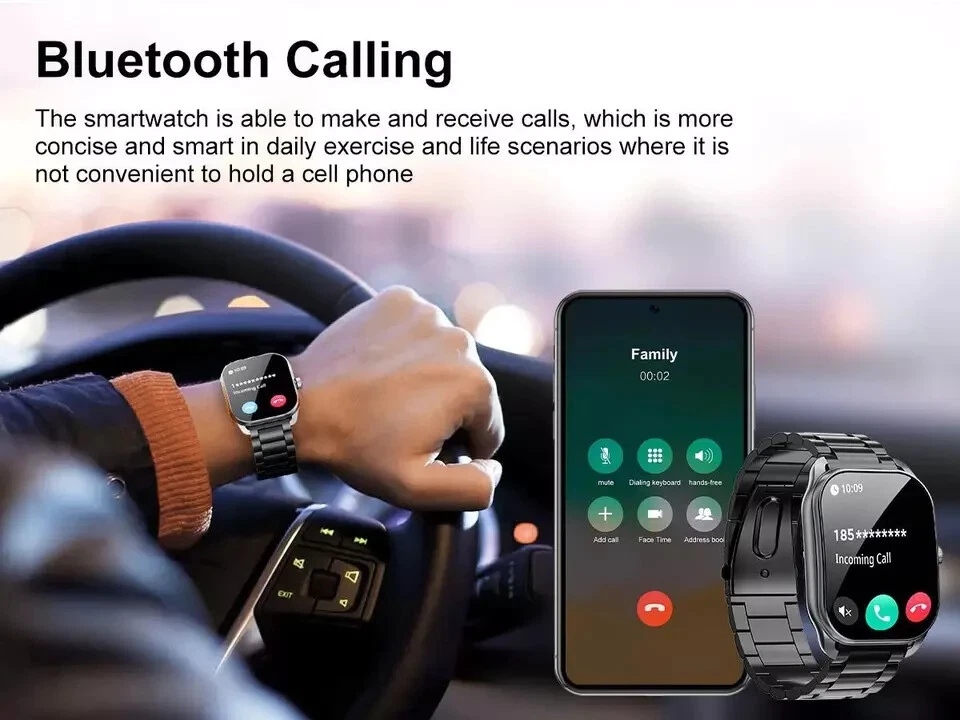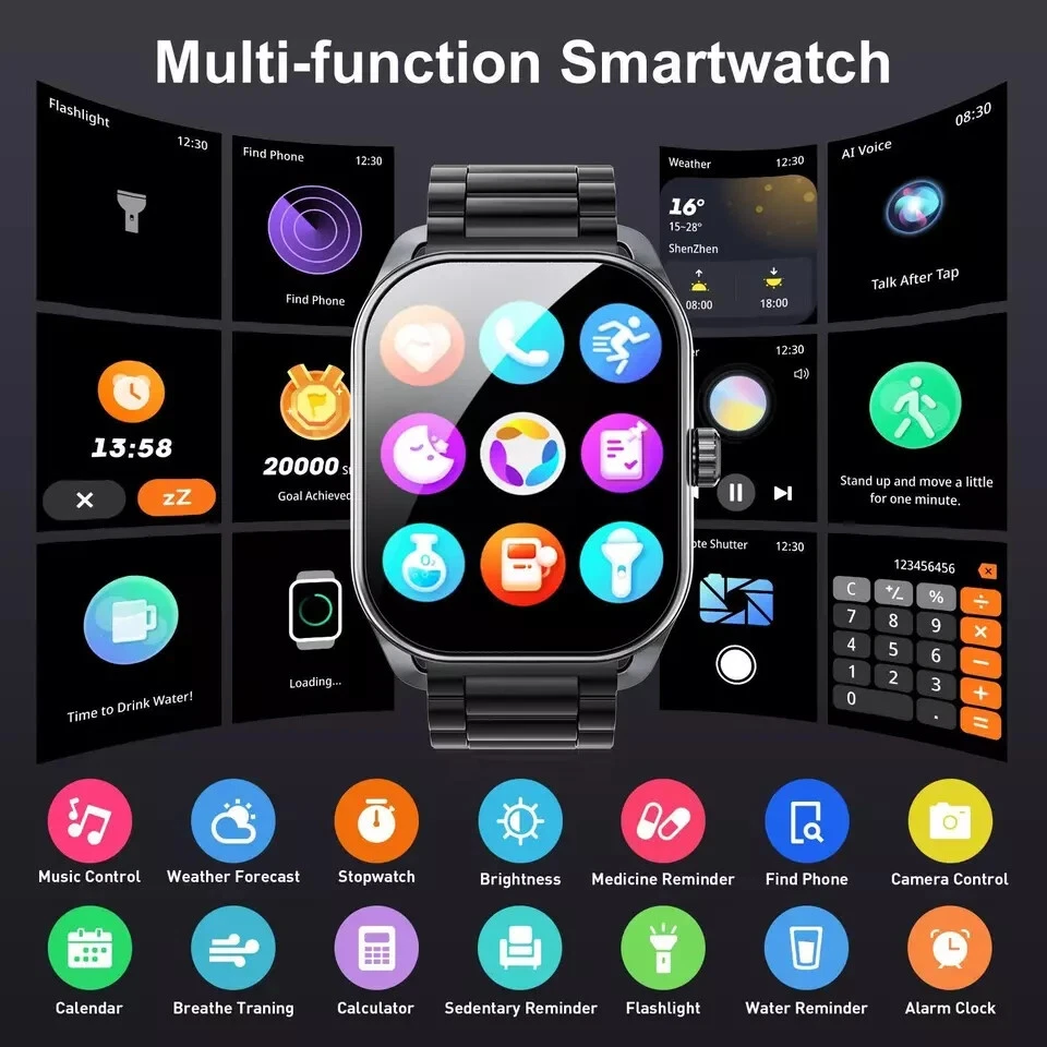 Introducing the Karchilor 2024 Smart Watch for Men, featuring a 2.01-inch curved screen and Bluetooth connectivity. This smartwatch is perfect for fitness enthusiasts and comes equipped with features like heart rate monitoring, sleep monitoring, and a passometer. The watch is also compatible with iOS and Android operating systems, and has a battery life of up to 7 days. The Karchilor Smart Watch is designed to be both stylish and functional, with a fine steel band and a square screen shape. It is waterproof up to a certain depth, making it suitable for use during outdoor activities. The watch also has a voice assistant built-in and can be controlled through multiple dials. Stay on top of your fitness goals with this Smart Bracelet, perfect for all compatible with iOS.