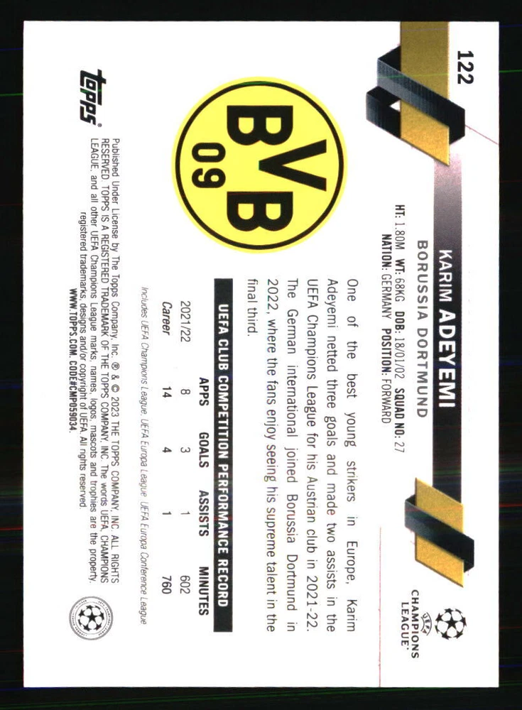 Autographed: No Card Number: 122 Season: 2022 Sport: SOCCER Set: 2022-23 Topps UEFA Club Competitions Year Manufactured: 2022 Type: Sports Trading Card Team: Borussia Dortmund Manufacturer: Topps Player|Athlete: Karim Adeyemi Graded: No