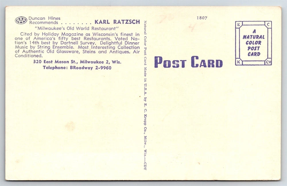 Karl Ratzsch's Old World Restaurant Milwaukee WI C1940's Postcard U23 Thank you for visiting! This is a standard size postcard, 3.5" X 5.5". In stock, usually ships within 24 hours of your purchase. Please ask questions if you are unsure about anything. Our goal is for your complete satisfaction with the postcard and your experience. Check all my other listings in my store. RETIREDWITHBOOKS Powered by SixBit's eCommerce Solution