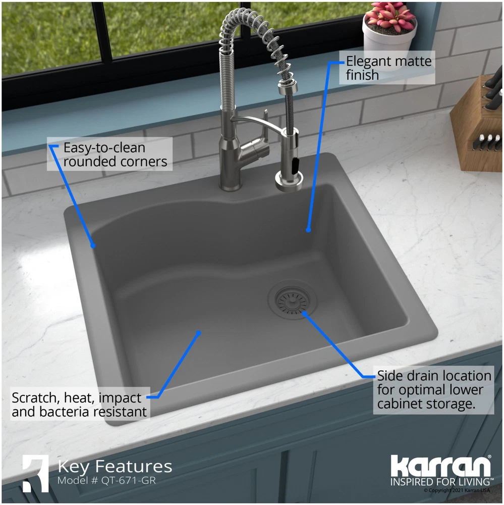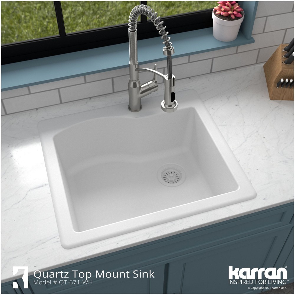 Powered by Frooition All Categories Karran USA QT-671 Quartz QT 25" Drop In Single Basin Quartz Composite Kitchen Sink Overview Item Description With its spacious single bowl, this design is both practical and elegant. Karran quartz composite sinks are extremely durable and are engineered to stand up to the toughest daily kitchen tasks. Karran QT-671 Features: Covered under Karran's 25 year limited warranty Constructed of quartz composite Drop In installation – sink will drop into a cutout in the countertop Single basin design for maximum work space Sound absorbent construction to prevent dish clatter and under cabinet condensation Sink comes pre-drilled with one faucet hole for use with a single hole faucet Right rear drain location increases available space under the sink All mounting hardware required for assembly is included Karran QT-671 Specifications: Sink Length: 25" (left to right) Sink Width: 22" (front to back) Sink Height: 9" (top to bottom) Basin Dimensions: 21-3/8" L x 17-7/8" W x 8-3/4" D Faucet Holes: 1 Minimum Cabinet Size: 27" Drain Connection: 3-1/2" Why Choose BuildInc? OUR PROMISE TO YOU About Us At Build, we promise to provide the best selection we can, most competitive pricing, and unmatched customer service. Our store has quality home improvement products from trusted manufacturers like Moen, American Standard, Delta, Kraus, Kichler, Progress Lighting, Schlage, Kwikset, Baldwin, Broan, NuTone, Air King, and Rev-A-Shelf. With over 200,000 home improvement products for you to choose from, we have just what you need to get your project done. Fast & Free Shipping We promise to make it our priority to get you your items as fast as we can. We ship from 440 warehouses around the country, ensuring that your product will get to you as soon as possible. We know you're eager to get your hands on your new purchase, we would be too. As a bonus, most items ship for free. Returns We are happy to accept returns of unused or defective items for a refund within 30 days from the date of delivery. For returns outside 30 days, please contact our Customer Service team to go over our options. For full details, please view the Shipping and Payments tab above. To initiate a return simply go to the eBay Returns Portal and submit a return request. We ask that all items be returned with all original components via a traceable method. Once your return is received and processed, we will quickly get your refund or replacement issued. If for any reason you are unsatisfied with your purchase or for product or warranty questions, please contact Customer Service team for assistance. More Items! View more great items! About Us | Shipping | Returns | Contact Us | FAQ | Collections | Special Offers! Powered by Frooition Frooition Frooition | No-js Template | eBay design, eBay store design, eBay shop design, eBay template design, eBay listing design (ver:froo_no_js) This listing is currently undergoing maintenance, we apologize for any inconvenience caused.