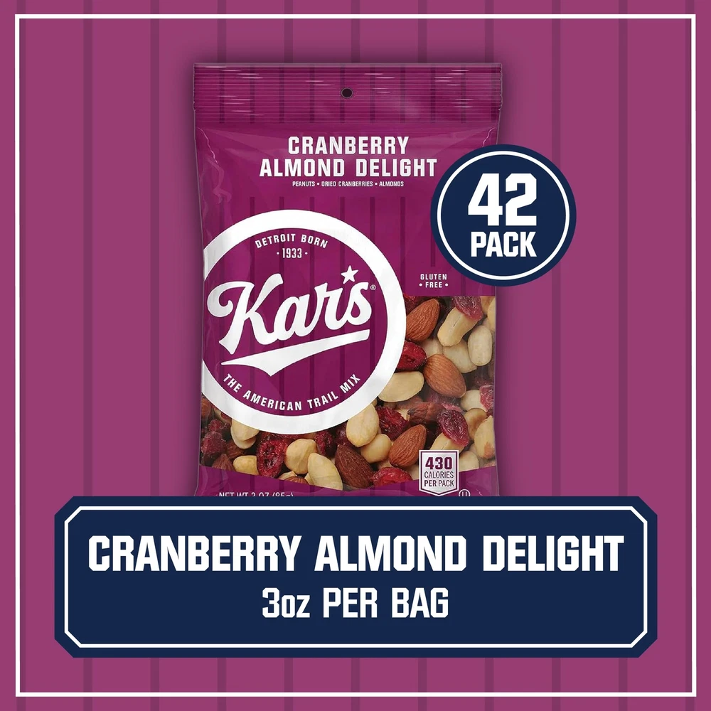 Satisfy your hunger with Kar’s Nuts Cranberry Almond Delight Trail Mix that includes (42) 3.0 oz individual snack packs. These bulk individually wrapped snacks are gluten-free, free of hydrogenated oils and trans fats, and are Certified. They make great travel snacks and are an easy addition to ’ lunches, concession stands, the office breakroom snacks stash, fundraising events and more. There’s no better way to describe it: this Kar’s Nuts individual packs of trail mix is truly a delight! It’s the perfect blend of gently roasted and salted peanuts, whole almonds and tart dried cranberries. This satisfying and sweet snack mix is the perfect mid-day pick-me-up, lunch snack or anytime sweet treat. We didn’t set out to change the way people snack. But we did have a hunch that perfectly roasted and salted nuts, naturally sweet raisins, cocoa candies and crunchy sunflower kernels would produce a winning Sweet 'N Salty Mix combination. And America agreed. Since our humble beginnings in 1933 outside of Tiger Stadium, Kar’s Nuts has become a nationwide sensation—and it all started with good ol’ roasted peanuts. You could say we pioneered the Sweet 'N Salty movement, and if you did, you’d be right. HEALTHY SNACKS FOR ADULTS & – Satisfy your hunger with this Kar’s Nuts Cranberry Almond Delight Trail Mix packets. This pack of bulk trail mix includes (42) 3 oz individually wrapped snacks. CRANBERRY ALMOND TRAIL MIX - This snack mix is truly a delight! It’s the perfect blend of gently roasted and lightly salted peanuts, whole almonds and tart dried cranberries. It’s a quick snack that’s both sweet and satisfying! GLUTEN-FREE – Kar’s Nuts trail mix snack packs are gluten-free and free of hydrogenated oils and trans fats. It is also certified ! You can feel good about enjoying and sharing these nut snack packs with your friends and family. INDIVIDUAL TRAIL MIX PACKS – Ready to enjoy individual packs make these bulk snacks easy to take on-the-go. Our conveniently packaged nut mix will leave you satisfyingly full. They’re great for travel snacks, ’ lunches, office breakrooms & more. KAR’S NUTS – Since our humble beginnings in 1933, Kar’s Nuts has become a nationwide sensation—and it all started with good ol’ roasted peanuts. You could say we pioneered the Sweet 'N Salty Nut Snack Mix movement, and if you did, you’d be right.