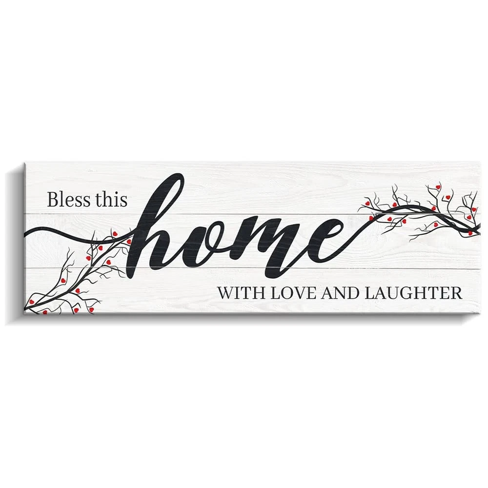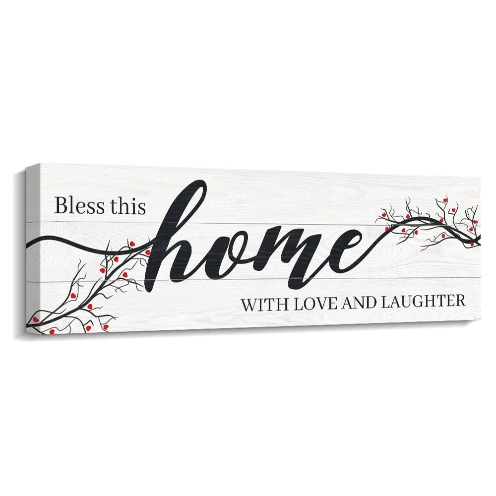 Kas Home Family Wall Decor Rustic Home Sign Inspirational Saying - Blessed This Home With Love And Laughter Canvas Wall Art for Bedroom Living Room Kitchen (5.5x16.5 inch, White - Home) Product Details Size: 16.5L" x 5.5W" Color: White - Home Brand: Kas Home MPN: Does not apply UPC: Does not apply EAN: Does not apply Product Dimensions: 16.5 x 5.5 x 0.2 inches Item Weight: 8.5 ounces Manufacturer: Kas Home Date First Available: April 19, 2022 Wall Decor With Love This home sign wall decor size is 5.5x16.5 inch, with inspirational quotes "Blessed This Home With Love And Laughter", that shows how much you care your family! Safe & Durable Blessed sign is made of high quality canvas, professionally digitally printed with vibrant colors, high toughness, wrinkle resistant, fade resistant and can be used for a long time. Warm Gift This family wall decor can meet your daily home decoration, suitable for hanging in bedroom/living room/kitchen etc. It is also a great gift for family and friends during the holidays! Our love decor ensure quick safe arrival at your home or office. Can be hung on the wall or placed on the countertop when received Its production process is being monitored to secure its quality, we proudly stand behind your purchase, if the home sign does not exceed your expectations, simply email us, we are always ready to help you!