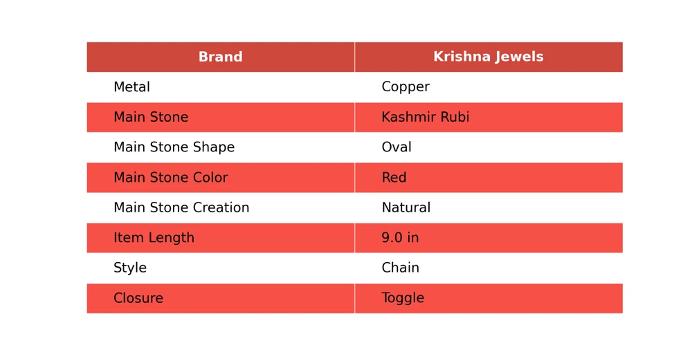 Note: Natural gemstones can vary slightly in design and color due to their unique formation. Welcome to KrishnaJewels123 Explore Our Handmade Jewelry Collection Product Details: SKU: AB-9 Gemstone: Kashmir Rubi Stone Shape: Oval Length: 9 Inches Width: Inches Sophisticated charm and enduring quality have long been hallmarks of our fashion collection. Valued for its elegance and versatility, our designs are staples in modern fashion, offering a perfect balance of beauty and durability. Our fashion jewelry combines timeless appeal with contemporary craftsmanship. Known for its hypoallergenic qualities and resistance to wear, each piece enhances the natural brilliance of gemstones, creating a stunning, refined look. Ideal For: Mother’s Day Father’s Day Promises Valentine’s Day Halloween Celebrations Christmas Gifts New Year Festivities Gifts for Mom Gifts for Her Need more details or personalized advice? Don’t hesitate to reach out! We’re here to assist you promptly. Each piece at KrishnaJewels123 is handcrafted with care and passion. As experts in creating exquisite fashion jewelry, we take pride in our meticulous craftsmanship. Our collection features a diverse range of designs, each enhanced by genuine gemstones and created by our skilled artisans. Thank you for visiting KrishnaJewels123. We hope you find joy in exploring our collection and enjoy your shopping experience with us!