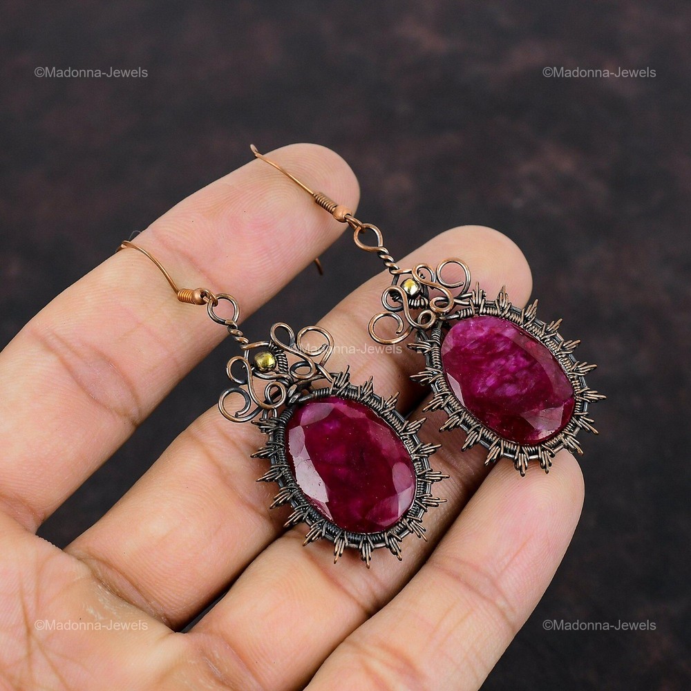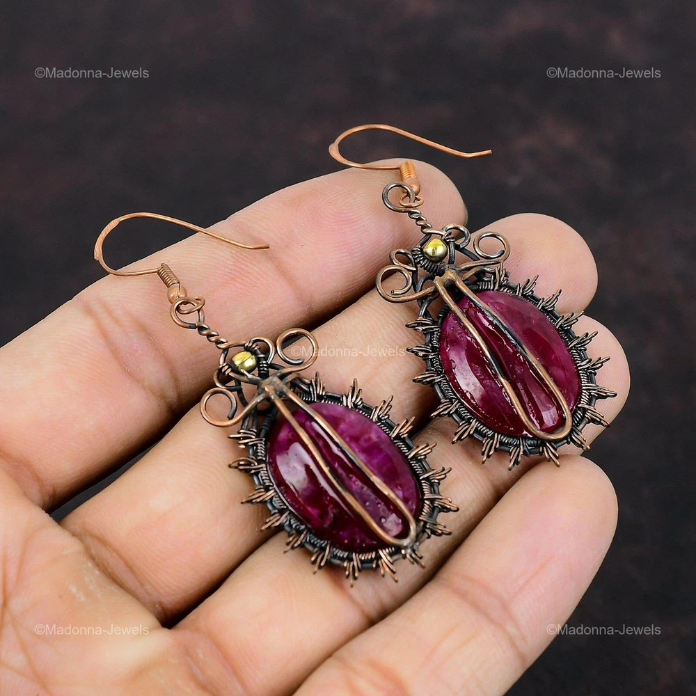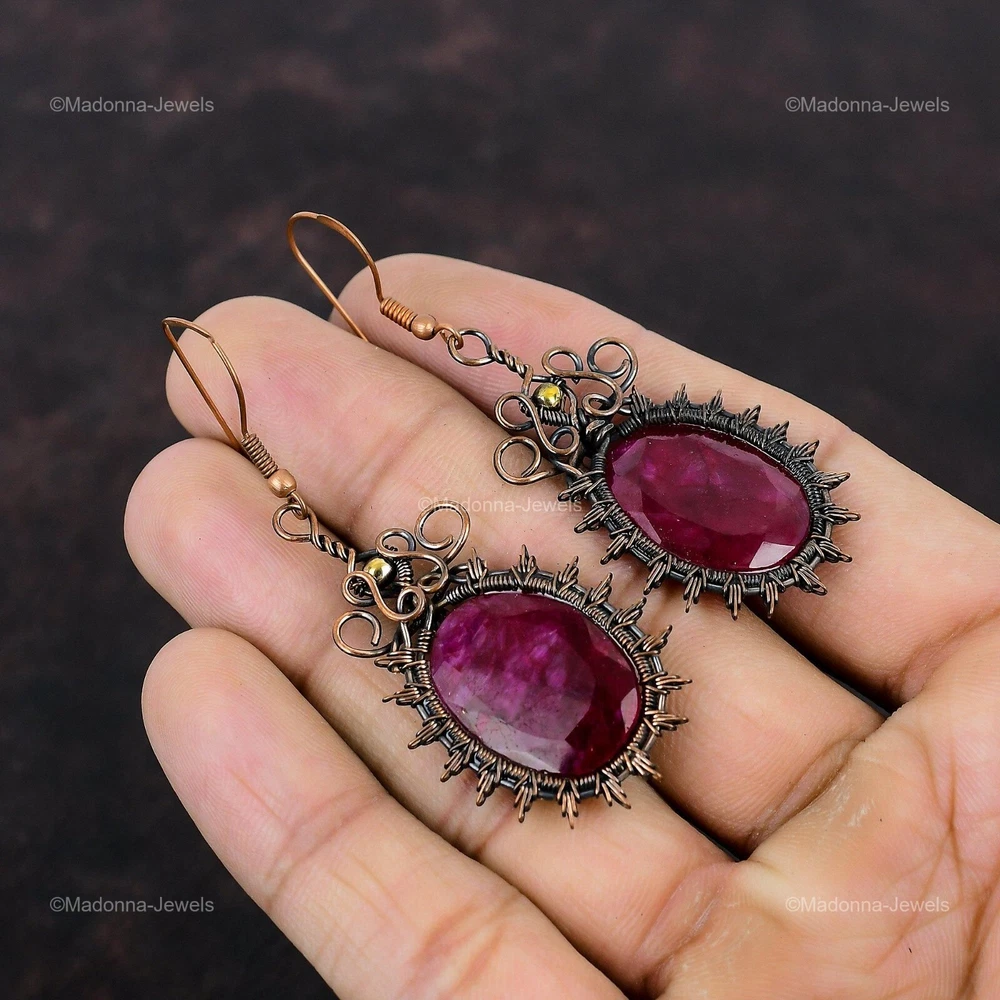 Welcome to Madonna Jewels Mothers day Sale Kashmir Rubi Stone Wire Wrapped Dangle Birthday Earrings Copper Handmade Earrings, Wire Wrapped Earrings, Wire Wrapped Jewelry, Copper Pendant, Copper Wire Earrings, Wrapped Jewelry, Wire Wrap Earrings, Wire Wrap Jewelry SKU : UFWE-74 Gemstone : Kashmir Rubi Stone Shape : Oval Metal Purity : Unknown Copper Length : 70 Millimeters Width : 25 Millimeters Copper has been used for jewelry making for thousands of years, dating back to ancient civilizations such as the Egyptians, Romans, and Aztecs. Copper was valued for its beauty, versatility, and durability, and was often used to make everything from jewelry and coins to cookware and tools. In addition to its historical significance, copper jewelry also offers several benefits. Copper is a natural conductor of heat and electricity, which makes it ideal for energy healing and therapeutic purposes. Wearing copper jewelry is believed to have various health benefits, such as improving circulation, reducing inflammation, and boosting the immune system. Some people also believe that copper jewelry has the ability to balance energy and improve mood. For Mother's Day Gift For Father's Day Gift For Promise For Valentine's Day For Halloween Party For Christmas Day Gift For New Year Party For Mom For Her If you can't find the information you need or need some advice for your design? Feel free to contact us. We are fast to reply :) All our work is made by hand with Love and Care in our workshop Thank you so much for visiting and hope you enjoy shopping with us MadonnaJewels is committed to delivering the best quality sterling silver jewelry to customers. As a handmade jewelry manufacturer, we offer an extensive selection of copper gemstone jewelry that showcases the brilliance of our craftsmanship. We are an experienced handmade jewelry supplier with expertise in embellishing gemstones to suit every style. We offer you the liberty to create your jewelry ensemble with sparkling, earthy, and pure gemstones. Our Talented artisans masterfully handcraft each piece of jewelry you see here. Our pieces are made with genuine gemstones. The one-of-a-kind piece you see here is the same exact piece you will receive.