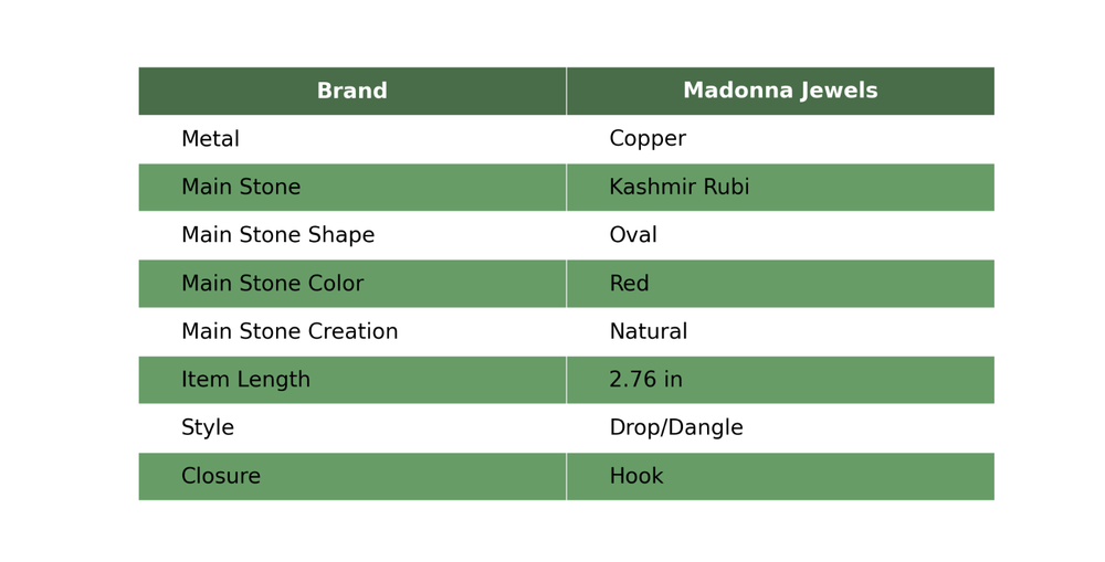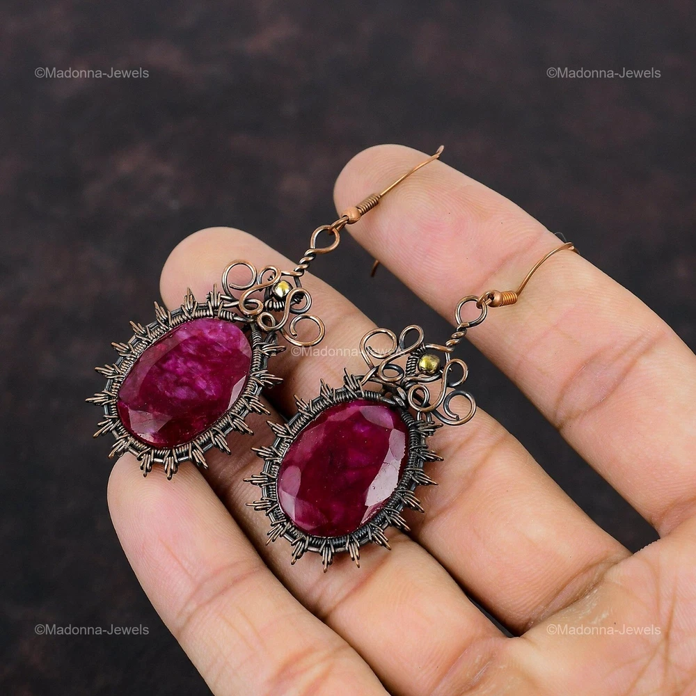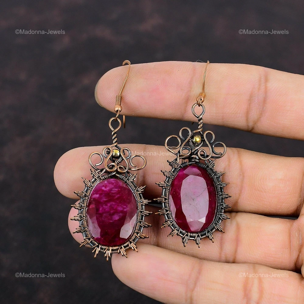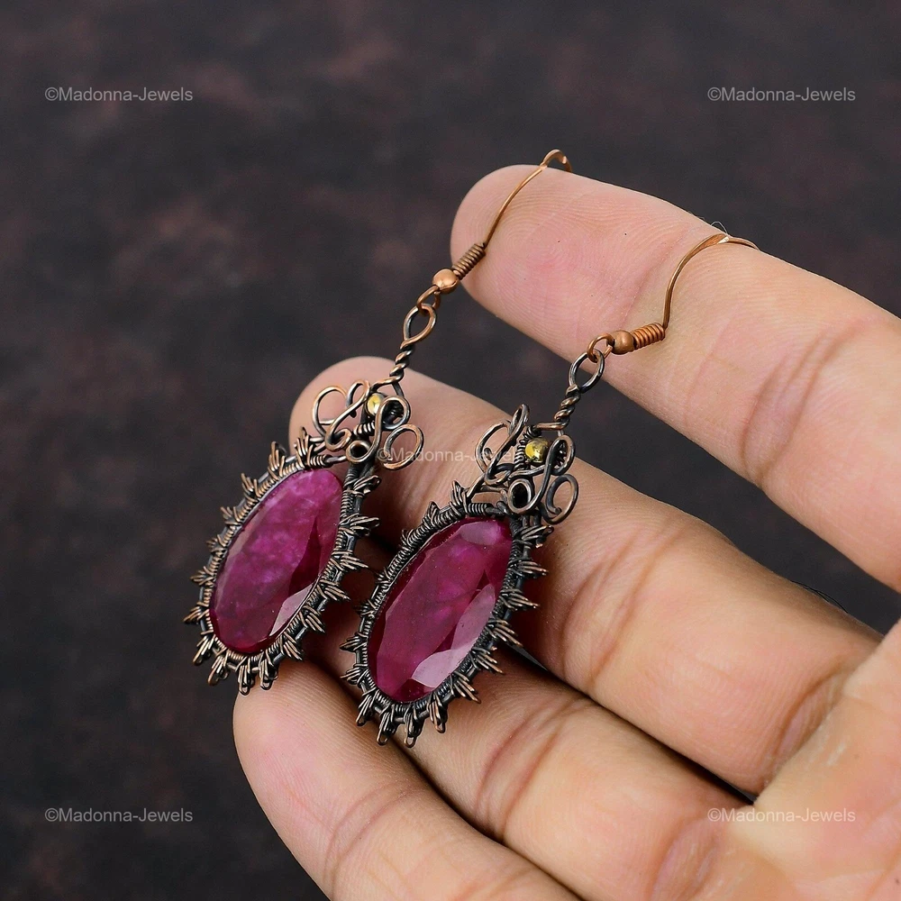 Welcome to Madonna Jewels Mothers day Sale Kashmir Rubi Stone Wire Wrapped Dangle Birthday Earrings Copper Handmade Earrings, Wire Wrapped Earrings, Wire Wrapped Jewelry, Copper Pendant, Copper Wire Earrings, Wrapped Jewelry, Wire Wrap Earrings, Wire Wrap Jewelry SKU : UFWE-74 Gemstone : Kashmir Rubi Stone Shape : Oval Metal Purity : Unknown Copper Length : 70 Millimeters Width : 25 Millimeters Copper has been used for jewelry making for thousands of years, dating back to ancient civilizations such as the Egyptians, Romans, and Aztecs. Copper was valued for its beauty, versatility, and durability, and was often used to make everything from jewelry and coins to cookware and tools. In addition to its historical significance, copper jewelry also offers several benefits. Copper is a natural conductor of heat and electricity, which makes it ideal for energy healing and therapeutic purposes. Wearing copper jewelry is believed to have various health benefits, such as improving circulation, reducing inflammation, and boosting the immune system. Some people also believe that copper jewelry has the ability to balance energy and improve mood. For Mother's Day Gift For Father's Day Gift For Promise For Valentine's Day For Halloween Party For Christmas Day Gift For New Year Party For Mom For Her If you can't find the information you need or need some advice for your design? Feel free to contact us. We are fast to reply :) All our work is made by hand with Love and Care in our workshop Thank you so much for visiting and hope you enjoy shopping with us MadonnaJewels is committed to delivering the best quality sterling silver jewelry to customers. As a handmade jewelry manufacturer, we offer an extensive selection of copper gemstone jewelry that showcases the brilliance of our craftsmanship. We are an experienced handmade jewelry supplier with expertise in embellishing gemstones to suit every style. We offer you the liberty to create your jewelry ensemble with sparkling, earthy, and pure gemstones. Our Talented artisans masterfully handcraft each piece of jewelry you see here. Our pieces are made with genuine gemstones. The one-of-a-kind piece you see here is the same exact piece you will receive.
