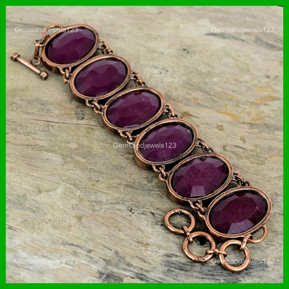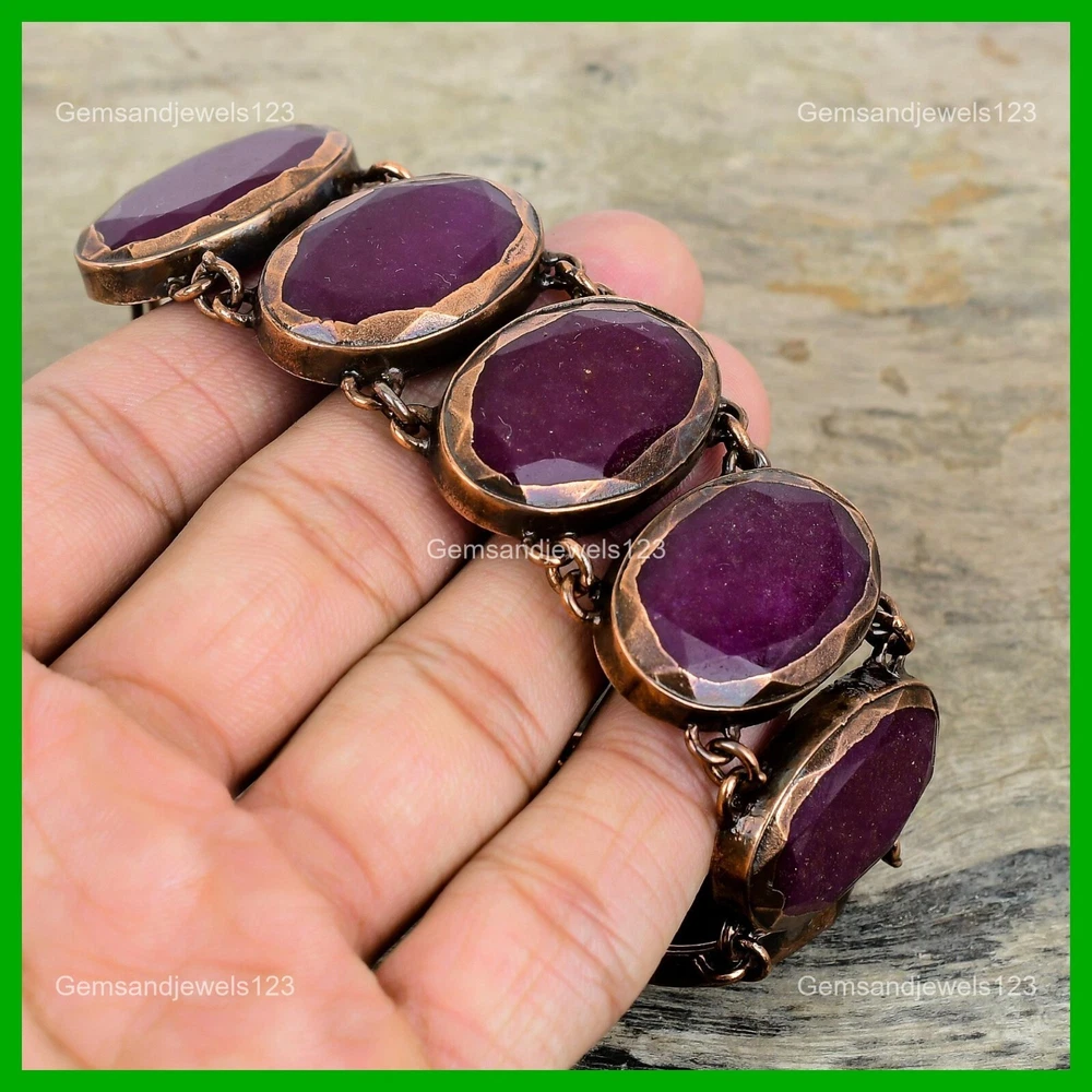 Note : Due to the natural formation of this gemstone. Slight Variation in design and color are to be expected. Welcome to gemsandjewels123 Mothers day Deal Kashmir Ruby Gemstone Copper Wife Electroformed Chain Bracelet Handmade Bracelet, Wire Wrapped Bracelet, Wire Wrapped Jewelry, Copper Pendant, Copper Wire Bracelet, Wrapped Jewelry, Wire Wrap Bracelet, Wire Wrap Jewelry SKU : VZB-28 Gemstone : Kashmir Ruby Stone Shape : Oval Metal Purity : Unknown Copper Bracelet Length : Adjustable Copper has been used for jewelry making for thousands of years, dating back to ancient civilizations such as the Egyptians, Romans, and Aztecs. Copper was valued for its beauty, versatility, and durability, and was often used to make everything from jewelry and coins to cookware and tools. In addition to its historical significance, copper jewelry also offers several benefits. Copper is a natural conductor of heat and electricity, which makes it ideal for energy healing and therapeutic purposes. Wearing copper jewelry is believed to have various health benefits, such as improving circulation, reducing inflammation, and boosting the immune system. Some people also believe that copper jewelry has the ability to balance energy and improve mood. For Mother's Day Gift For Father's Day Gift For Promise For Valentine's Day For Halloween Party For Christmas Day Gift For New Year Party For Mom For Her If you can't find the information you need or need some advice for your design? Feel free to contact us. We are fast to reply :) All our work is made by hand with Love and Care in our workshop Thank you so much for visiting and hope you enjoy shopping with us gemsandjewels123 is committed to delivering the best quality sterling silver jewelry to customers. As a handmade jewelry manufacturer, we offer an extensive selection of copper gemstone jewelry that showcases the brilliance of our craftsmanship. We are an experienced handmade jewelry supplier with expertise in embellishing gemstones to suit every style. We offer you the liberty to create your jewelry ensemble with sparkling, earthy, and pure gemstones. Our Talented artisans masterfully handcraft each piece of jewelry you see here. Our pieces are made with genuine gemstones. The one-of-a-kind piece you see here is the same exact piece you will receive.