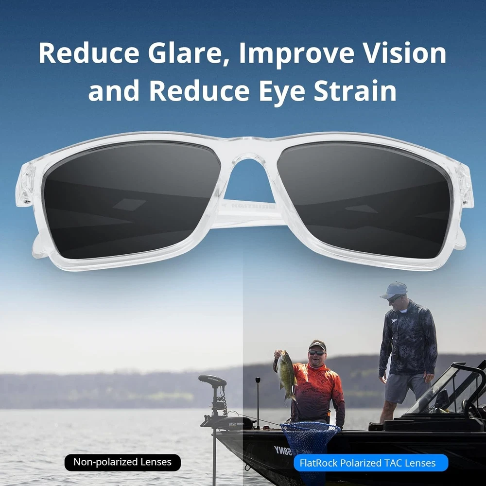 KastKing Flatrock Polarized Sunglasses The FlatRock sunglasses feature a lightweight pliable Grilamid frame for extended comfort during long periods of use. The frames are built to survive years of active use, they're ultra-lightweight, extremely flexible, resistant to heat & UV rays, and possess excellent memory and retain their shape. Previous page Next page 1 Colorful series 2 Stylish series Polarized Sports Sunglesses Polarization helps to reduce glare caused by reflected light which helps to improve vision and reduce eye strain and also allows anglers to see into the water and spot fish which essential for sight fishing. All KastKing eyewear lenses block 100% of the harmful UVA UVB rays. Base Lens Color Guide KastKing lenses are protected with a tough oleophobic coatings to protect the lenses from dirt, dust, oil, chemicals, and harsh saltwater conditions. Product Dimensions Enjoy all your outdoor activities in style and comfort with FlatRock polarized sports sunglasses designed for fashion and function. This comfortable lightweight frame is ideal for driving and sports activities such as biking, running, boating, fishing, and golfing. Polarized Fishing Sunglasses Huzzah Buying Options Skidaway Buying Options Flatrock Buying Options Osage Buying Options Skinner Buying Options Customer Reviews 4.4 out of 5 stars 2,911 4.4 out of 5 stars 9,516 4.5 out of 5 stars 1,111 4.5 out of 5 stars 555 4.4 out of 5 stars 85 Price $28.49 $ 28 . 49 $26.99 $ 26 . 99 $28.49 $ 28 . 49 $26.99 $ 26 . 99 $23.99 $ 23 . 99 Style FULL Wrap Design FULL Wrap Design Square Frame Design FULL Wrap Design One Piece Wide View Flame Width 5.28 inches 5.23 inches 5.39 inches 5.3 inches 5.6 inches Lens Width 2.44 inches 2.31 inches 2.28 inches 2.5 inches 5.7 inches Polarized ✔ ✔ ✔ ✔ ✔ Bifocal ✘ ✘ ✘ ✘ ✘ Man/Women Unisex Unisex Unisex Unisex Unisex