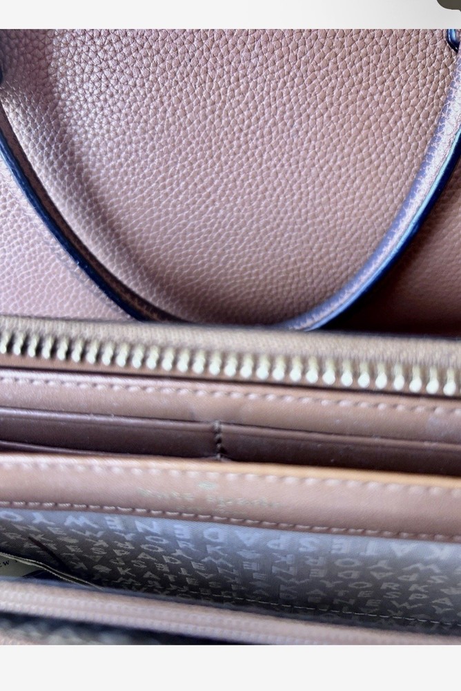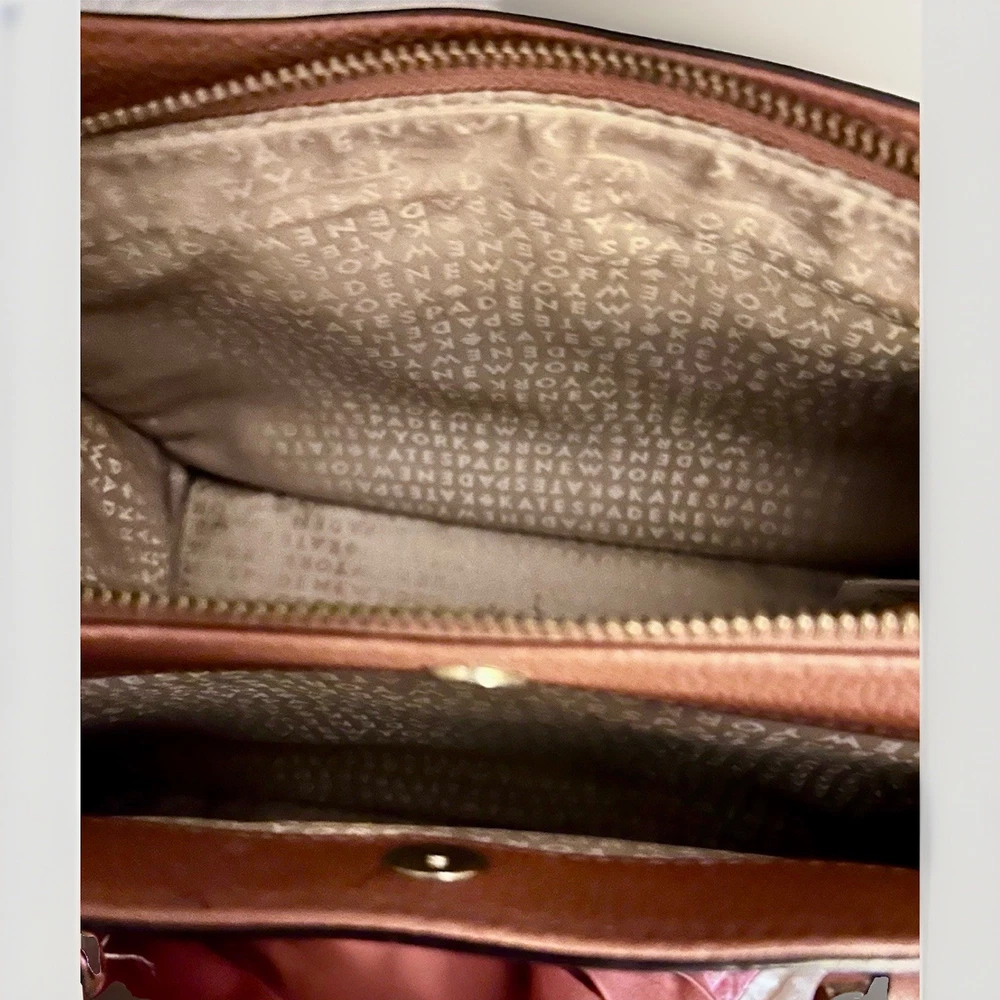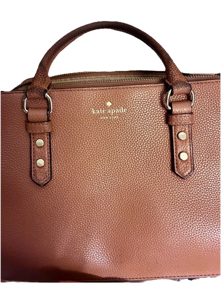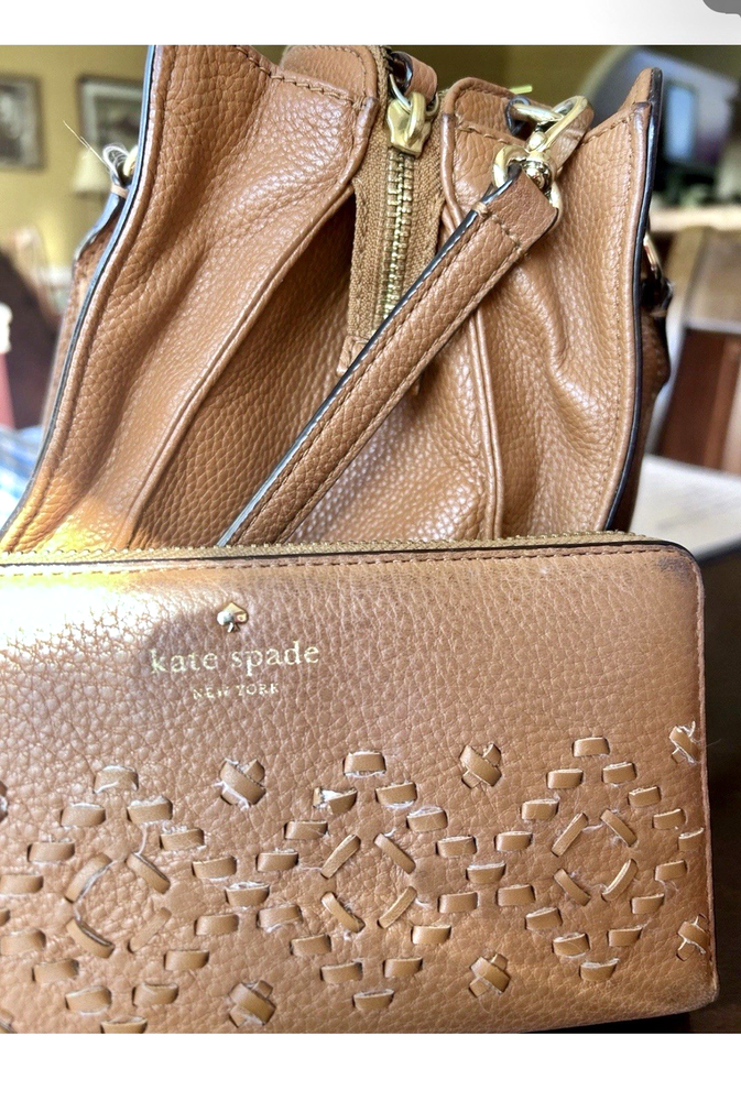 The product is a stylish Kate Spade brown leather tote handbag with a matching wallet. The tote features a fashionable design with a strap handle, making it convenient for everyday use. Crafted from high-quality leather, this accessory is perfect for any woman looking to add a touch of sophistication to her outfit.