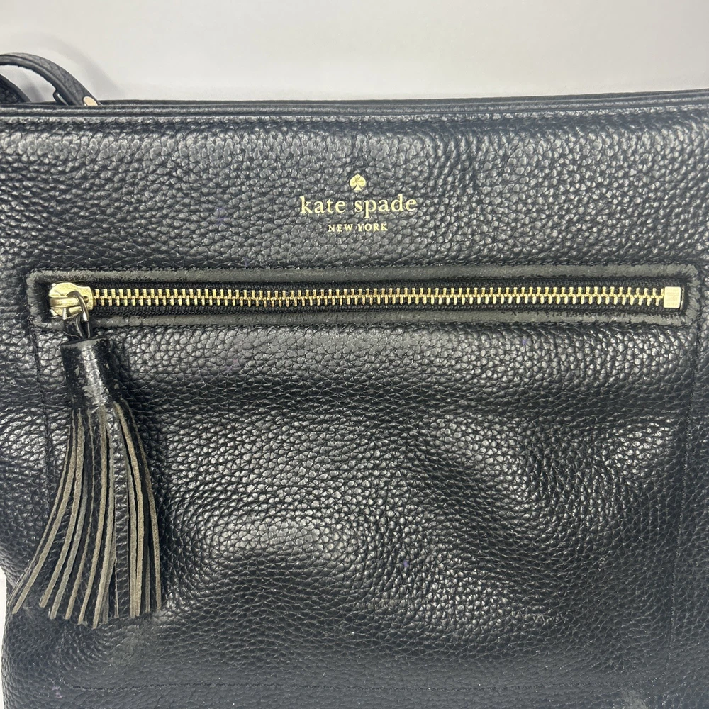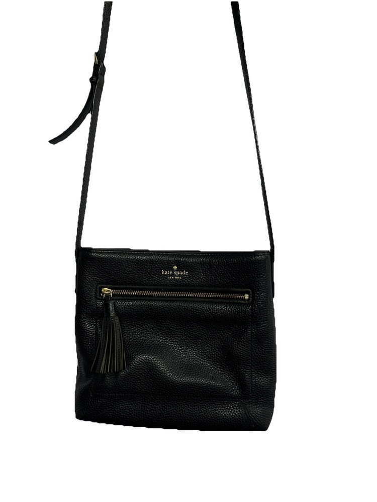 Handmade: No Personalize: No Bag Height: 8 in Vintage: No Hardware Material: Gold-Plated Finish: Pebbled Exterior Material: Leather Features: Adjustable Strap Lining Color: Black Hardware Color: Gold Shape: Rectangle Department: Women Handle/Strap Material: Leather Brand: Kate Spade Size: Small Bag Width: 10 in Character: Pebbles Style: Crossbody Exterior Color: Black Pattern: Solid Handle/Strap Color: Black Accents: Zipper Theme: Designer Lining Material: Polyester Accessories: Detachable Strap Closure: Zip Handle Style: Crossbody Strap