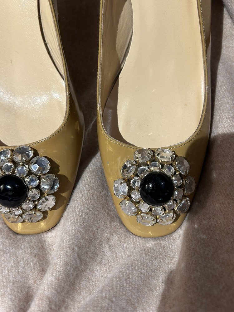 Kate Spade Italy Beige Patent Squared Toe Crystal Block Heels Size 7