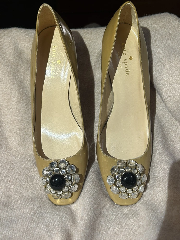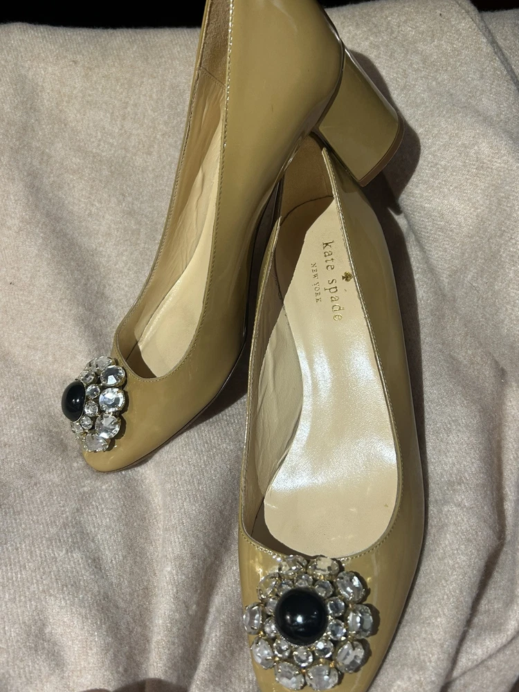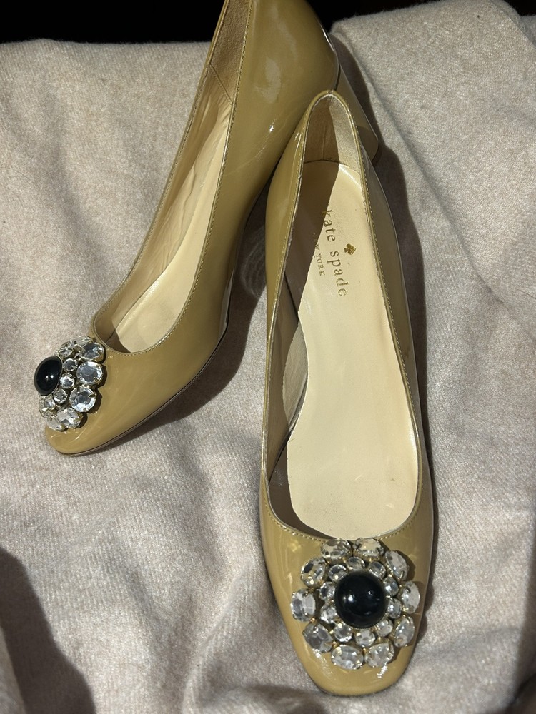Kate Spade Italy BEIGE Patent Squared Toe Crystal Block Heels Shoes 7