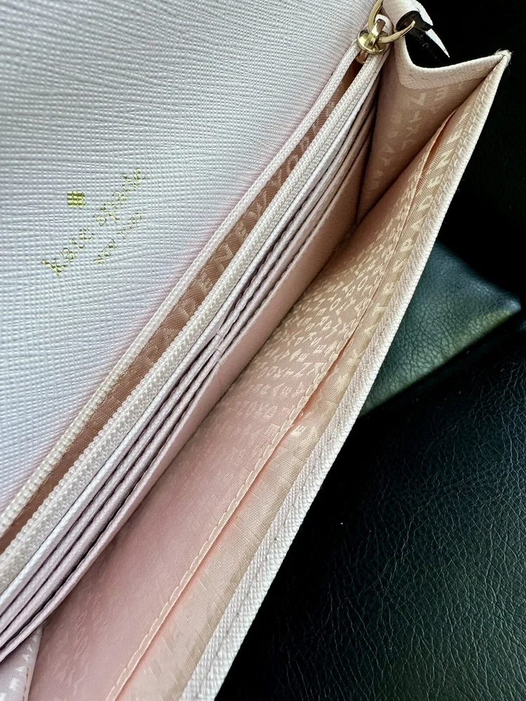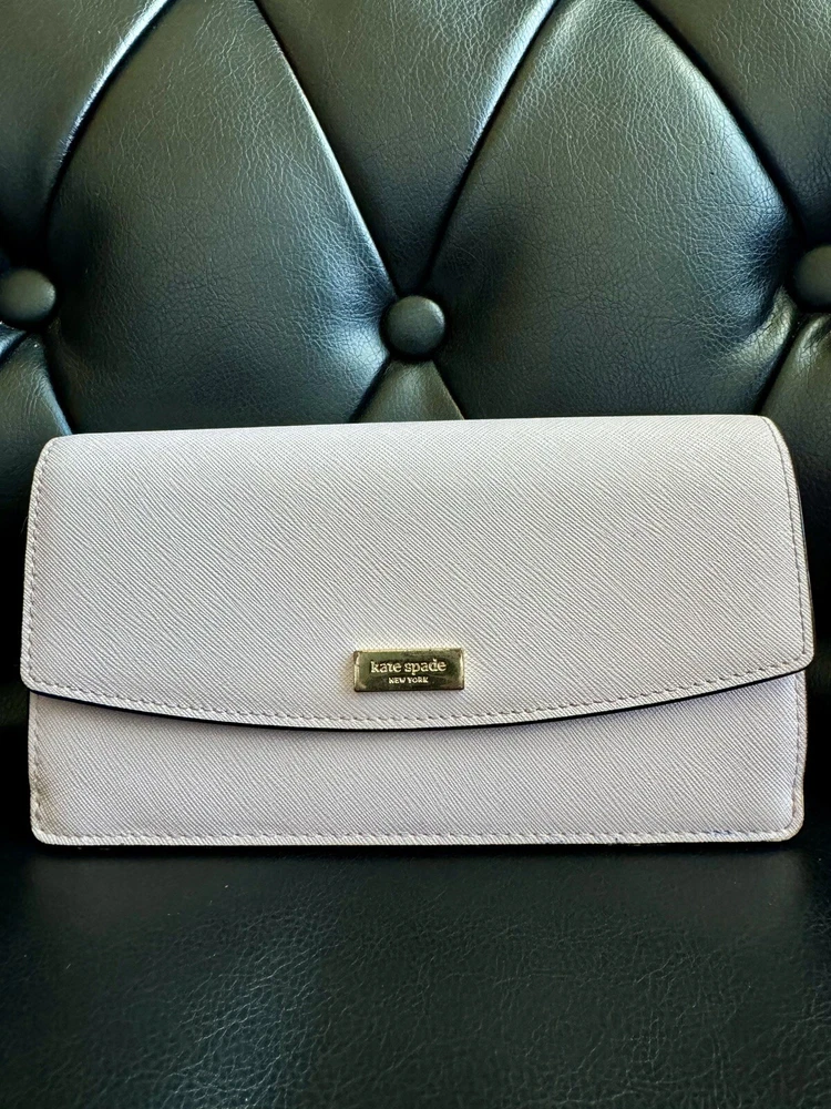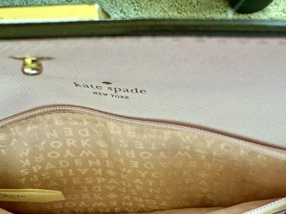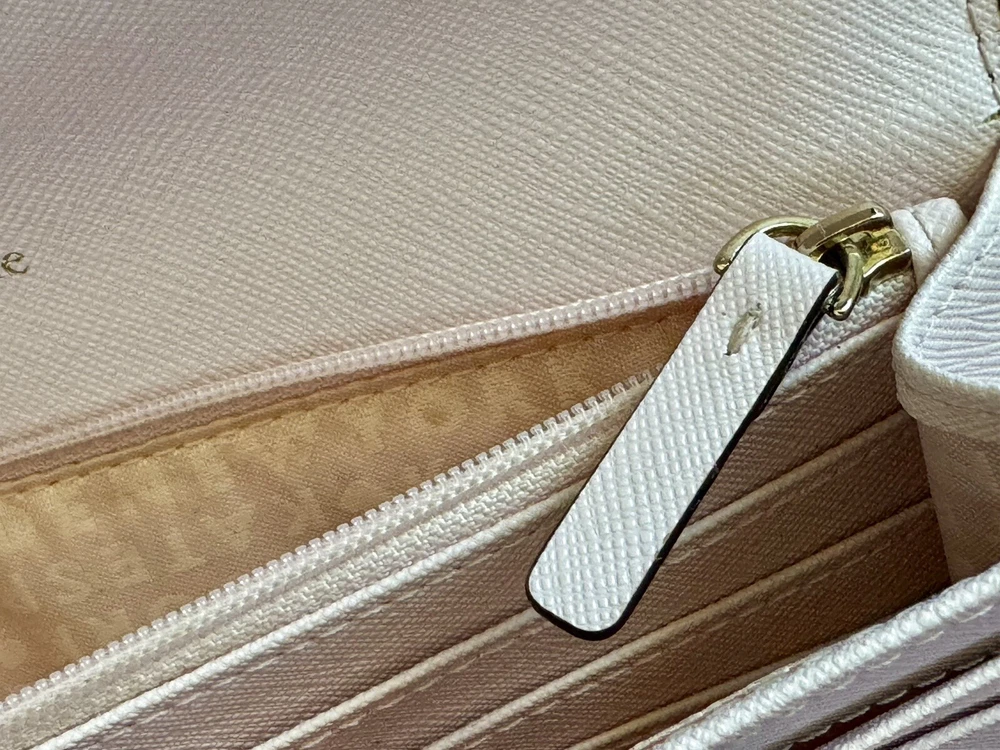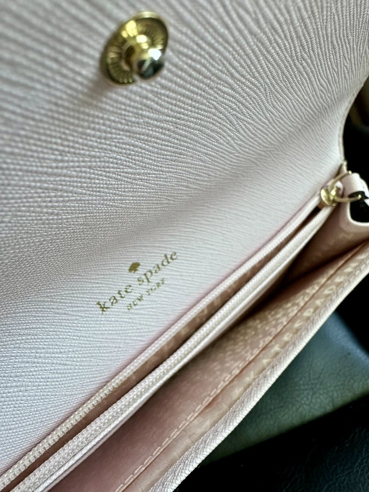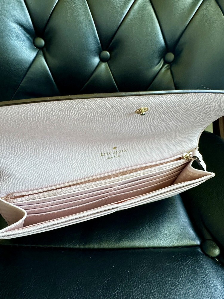 Handmade: No Vintage: No Theme: Rose Country of Origin: United States Brand: kate spade new york Character: Rose Accents: Zipper Personalize: No Color: Pink Pattern: Solid Department: Women Type: Wallet Material: Leather Features: Credit Card Style: Zip-Around