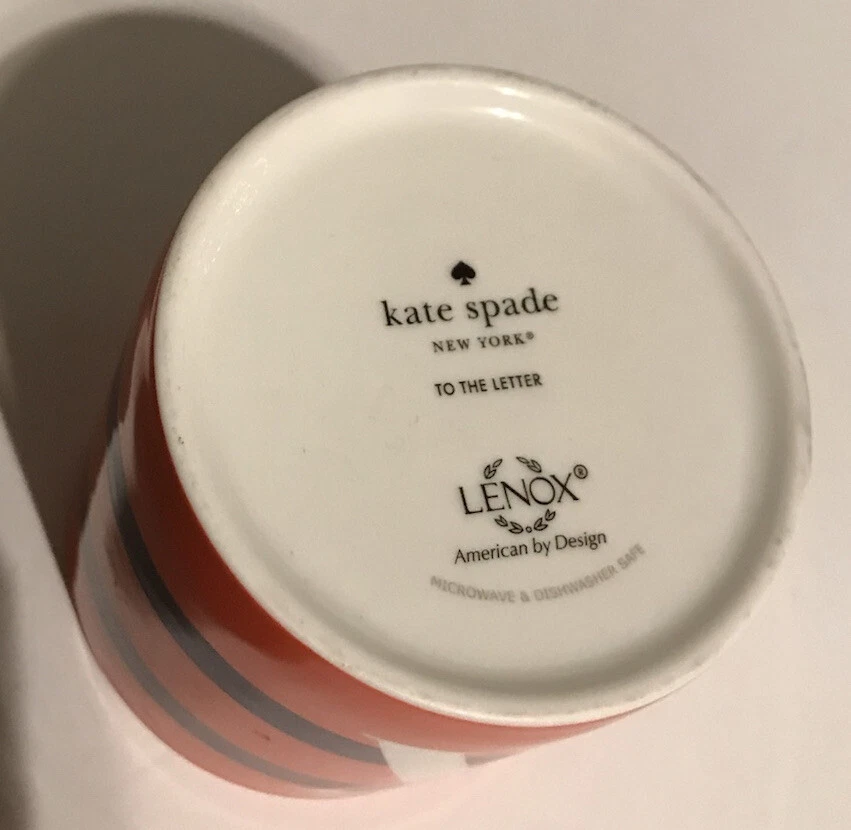 Brand: kate spade new york Handmade: No Custom Bundle: No Type: Mug Features: Dishwasher Safe, Microwave Safe Item Weight: 9 Oz Occasion: All Occasions Year Manufactured: N A Vintage: No Production Technique: Pottery Production Style: Art Pottery Department: Unisex Adults Original/Licensed Reproduction: Original Origin: New York Finish: Glossy Pattern: Stripes Time Period Manufactured: 2010-2019 Care Instructions: Machine Washable Item Diameter: 3.2 In Signed By: N A Capacity: 12 Oz Keeps Cold For: N A Product Line: Letter Mug Theme: Designer Keeps Hot For: N A UPC: Does not apply Style: Art Deco Signed: No Shape: Round Item Height: 3.5 In Backstamp: Printed Country/Region of Manufacture: United States MPN: N A Manufacturer Warranty: 0 gtin13: Does not apply Color: Multicolor Material: Porcelain
