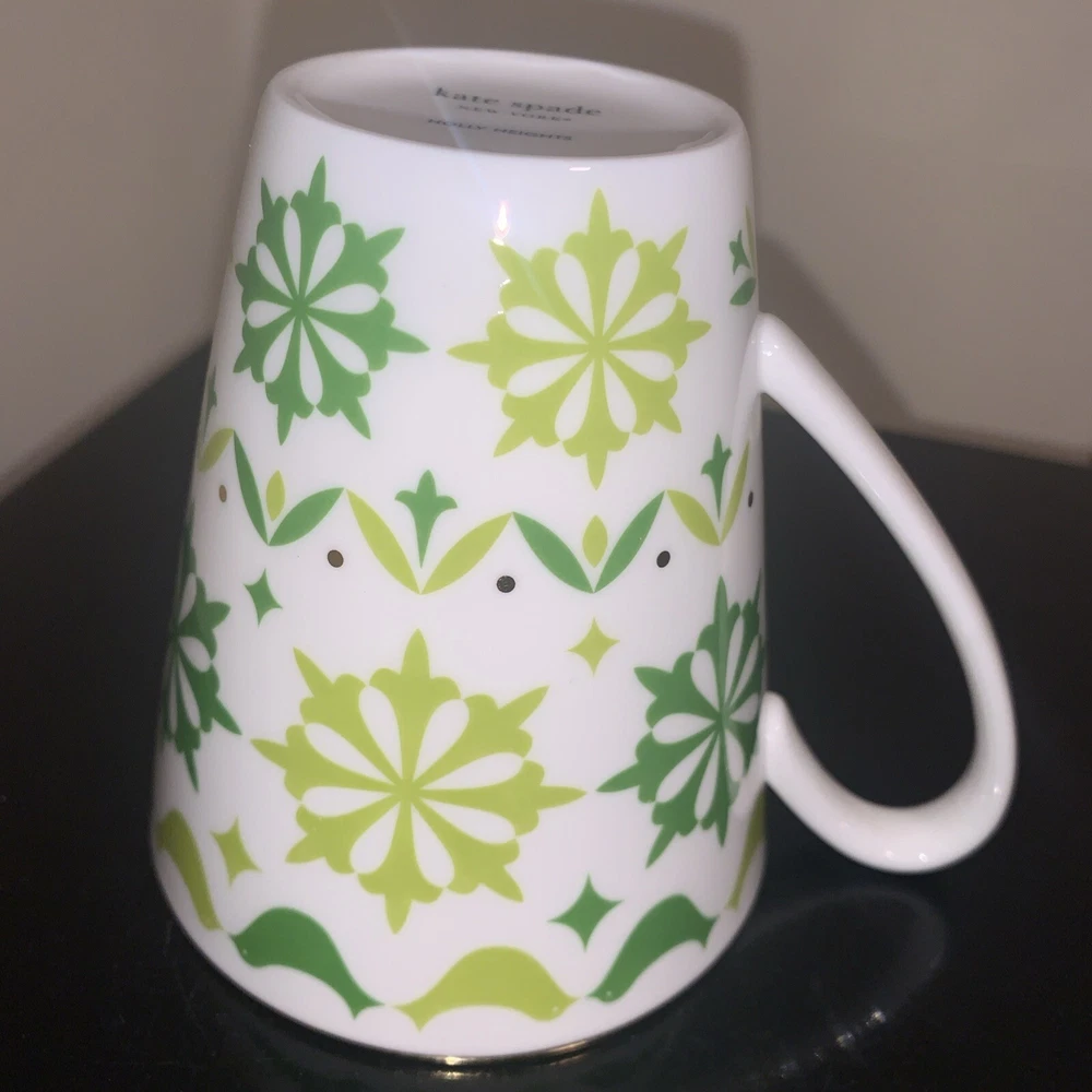 This Kate Spade New York Holly Heights Mug is a small round porcelain mug featuring a geometric floral and doves pattern in white and green colors. It is part of the Heights collection and has a capacity of 4 inches high and 3.5 inches in diameter, with a painted design. The mug is dishwasher safe, making it convenient for everyday use. Perfect for occasions like Best Wishes, Christmas, birthdays, or as a replacement piece in a set, this mug is a stylish and functional addition to any kitchen or collection.