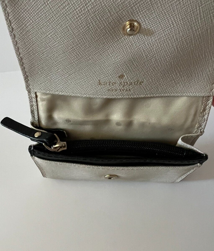 The Kate Spade New York Women's Hazel Black Bow Tuxedo Small Key Chain Wallet is a stylish accessory designed for women. This wallet features a sleek black color with a delicate bow accent, adding a touch of elegance to the design. Perfect for carrying essential items like keys and cards, this wallet is compact and convenient with a key chain attachment. The Kate Spade New York branding ensures a high-quality and fashionable accessory that complements a variety of outfits for any occasion.