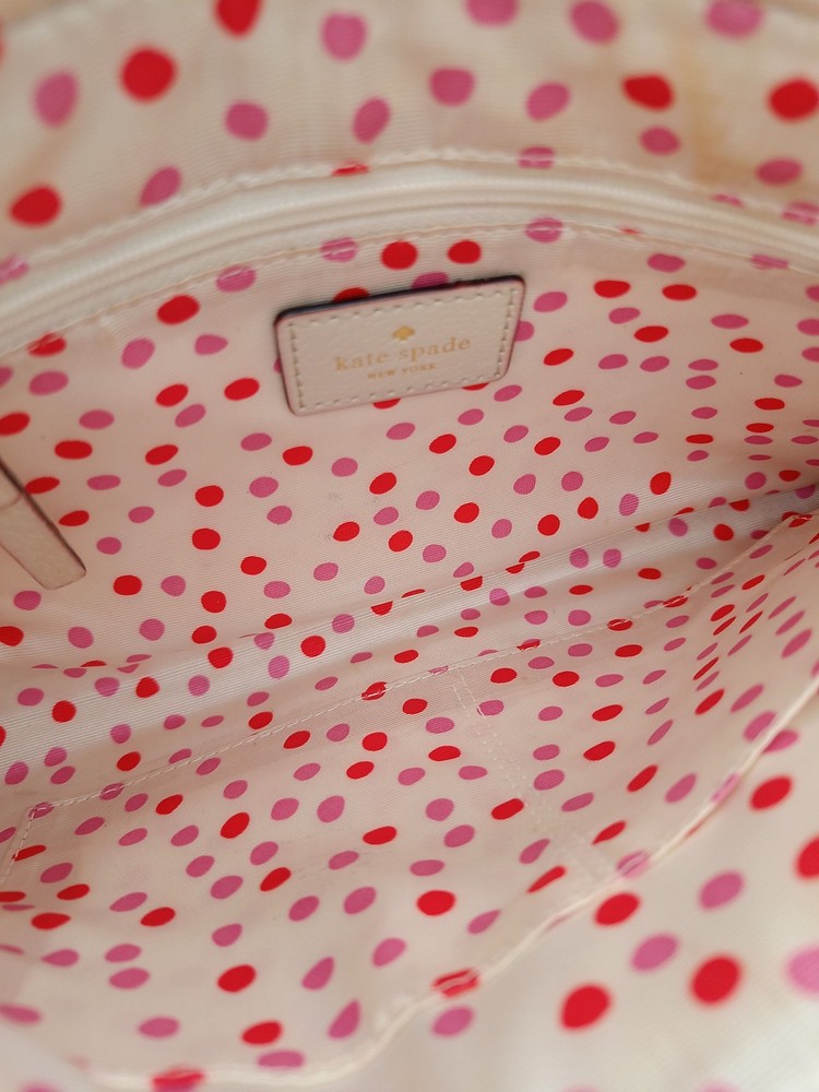 Item details Kate Spade Women's Bag Colour: Cream Material: Leather with Polyester Condition: Fair Defects: Minor Stain(s) Or Mark(s) SKU: 255-KYT39-6EQ Delivery Delivery within 5 working days. Packaged and shipped straight from our warehouse. Returns Easy 30 day returns. Money back guarantee. Quality guaranteed We quality check every single item on Thrift+. No more surprise stains or fake brands. Our team of experts manages the whole process of recirculating pre-owned clothes. Additional authentication checks on all designer items.