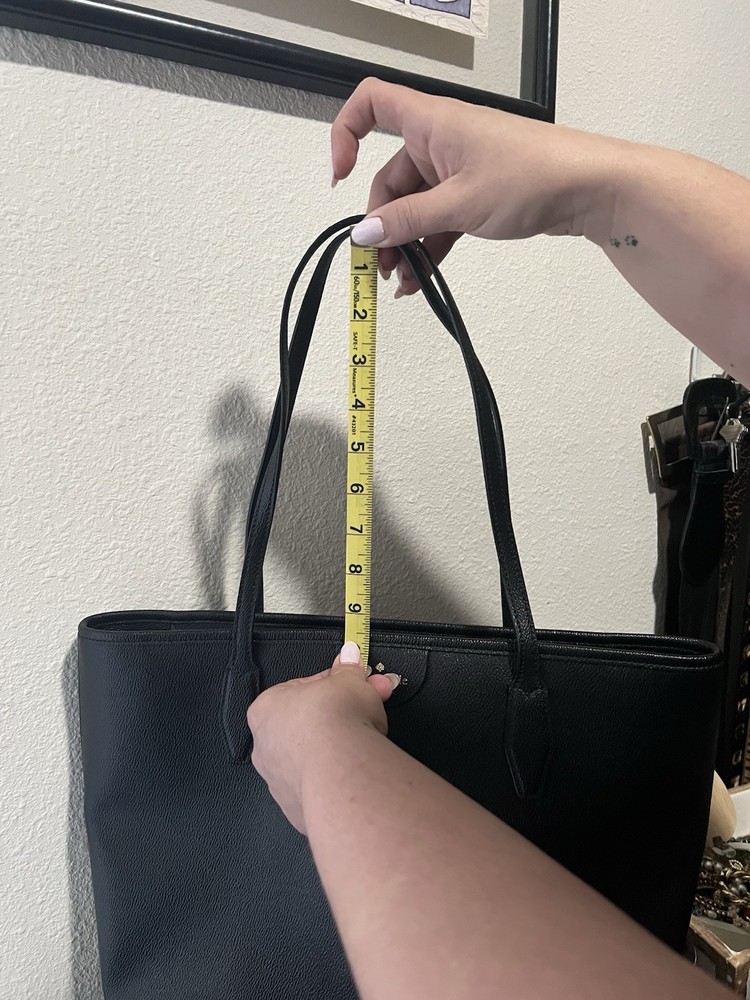 The Kate Spade New York Harper Women's Tote Bag in Black is a stylish and versatile accessory for any occasion. This medium-sized bag features double handles and a zip closure, making it perfect for carrying your essentials in style. The black leather exterior with classic accents and lined interior, along with pockets for organization, make it a practical and fashionable choice for workwear, business meetings, casual outings, or even a party or cocktail event. Perfect for the modern woman on the go.