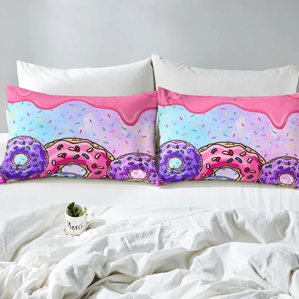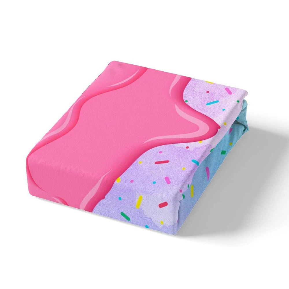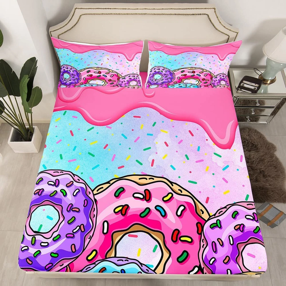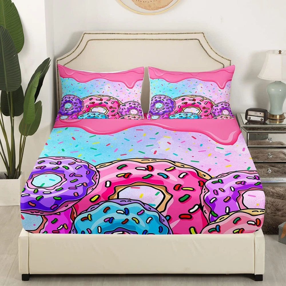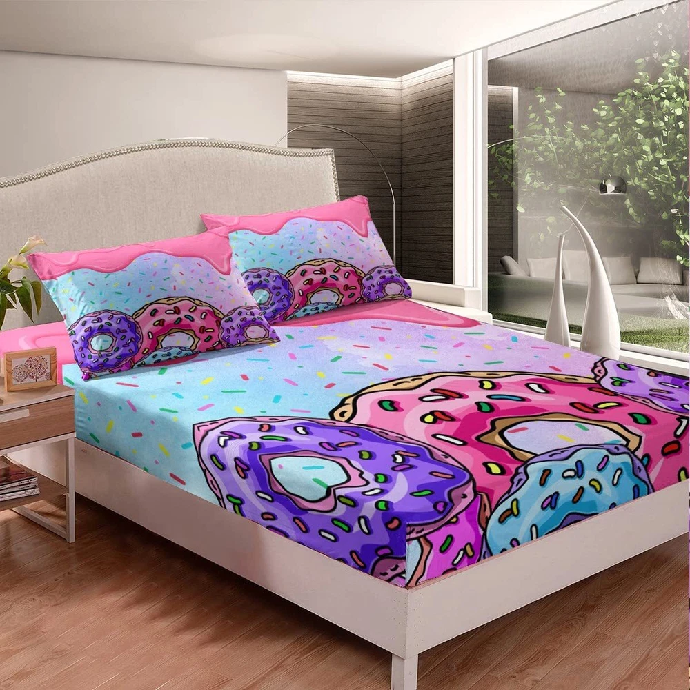Kawaii Donuts Fitted Sheet,Full Size Sweet Doughnut Collections Pink and Purp...